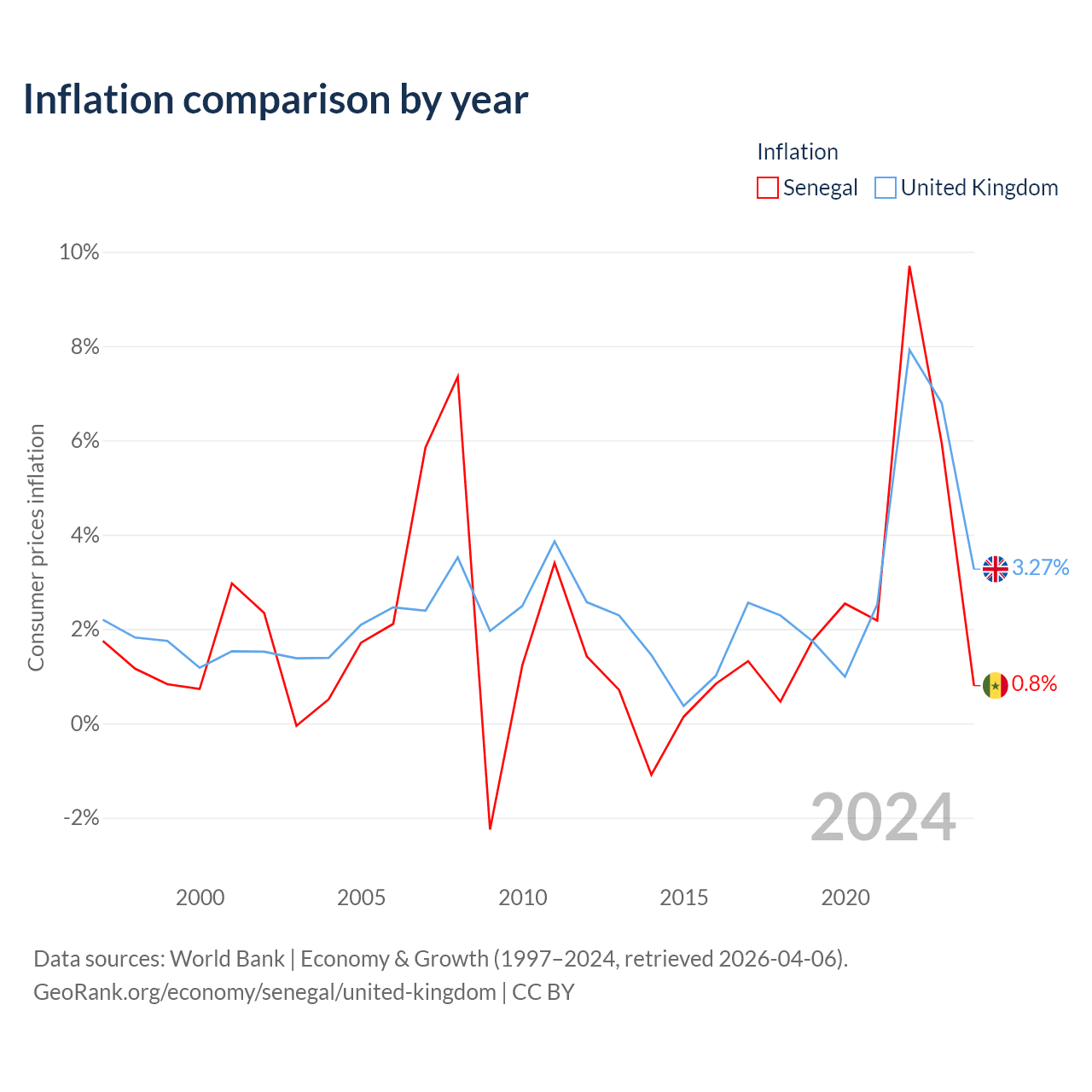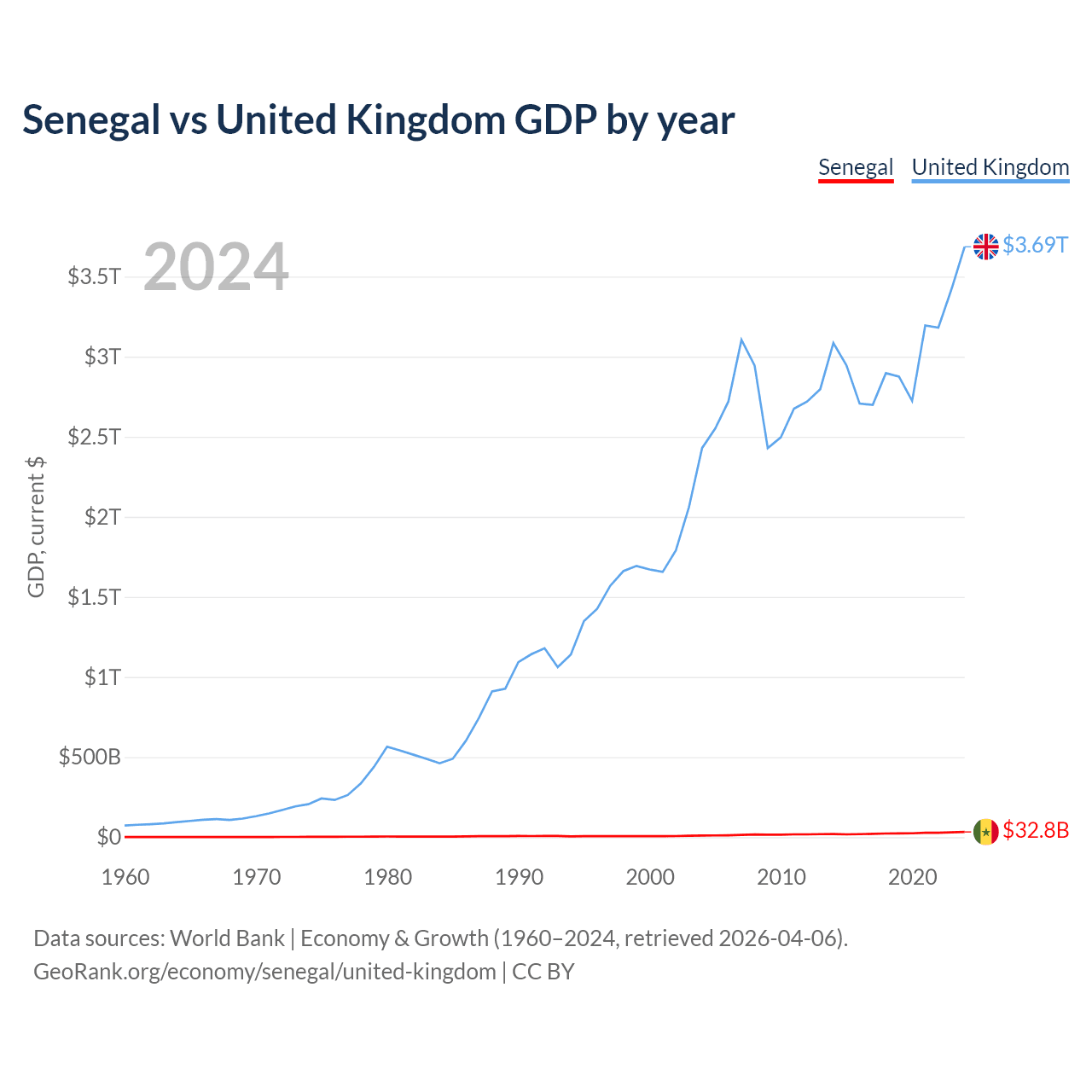 Senegal has a GDP of $32.8B compared to $3.69T for the United Kingdom, ranking 109/197 and 6/197 by economy size, respectively.