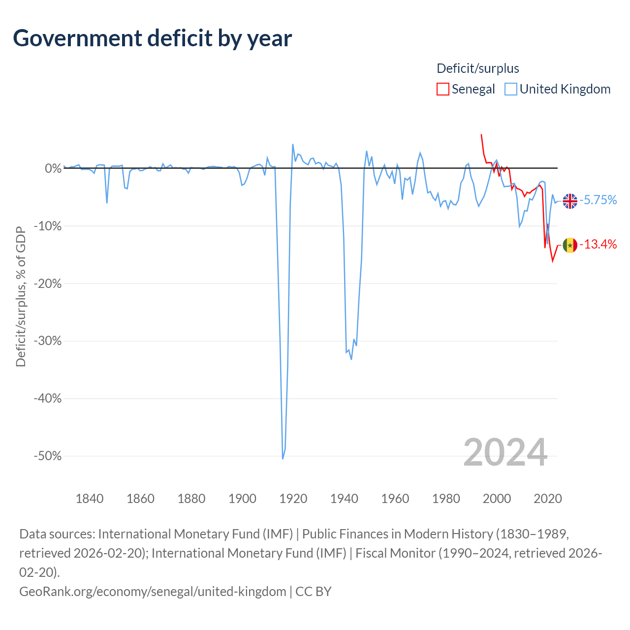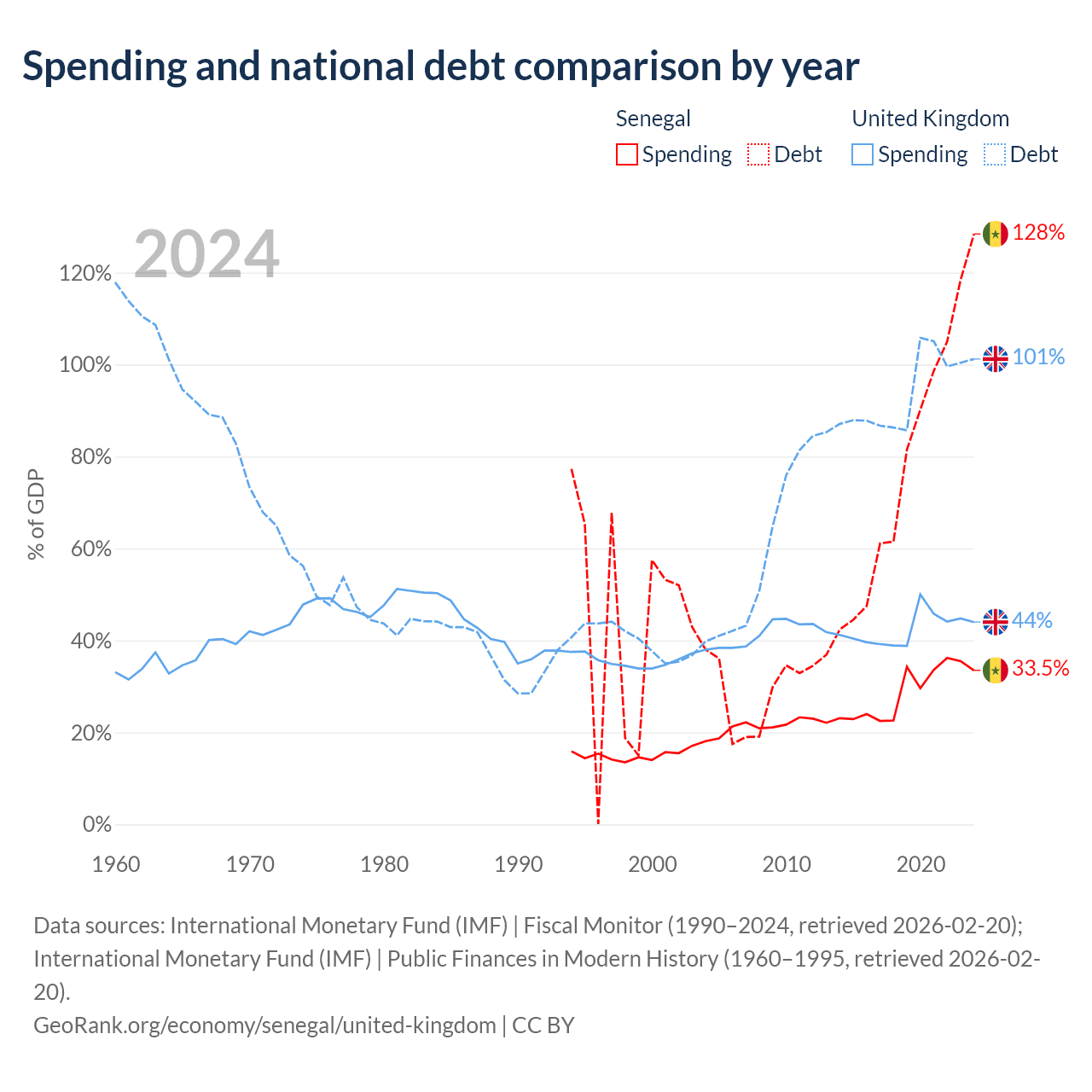 Senegal has $42.1B in government debt (128.4% of GDP), compared to $3.73T (101.2% of GDP) in the United Kingdom.