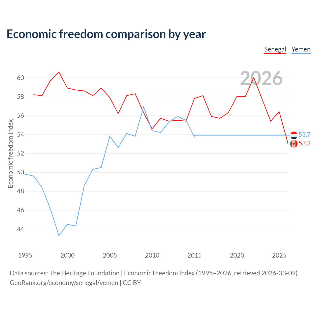 The Economic Freedom Index for Senegal is 53.2, ranking 140/197, compared to 53.7 for Yemen, ranking 138/197. The chart above displays a comparison of annual changes in economic freedom indexes.