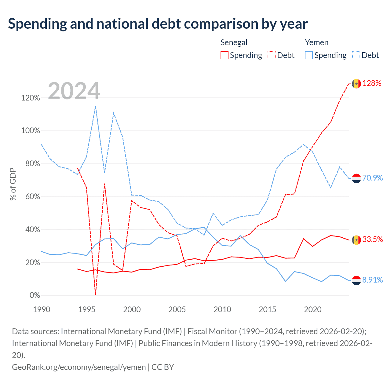 Senegal has $42.1B in government debt (128.4% of GDP), compared to $18.8B (70.9% of GDP) in Yemen.