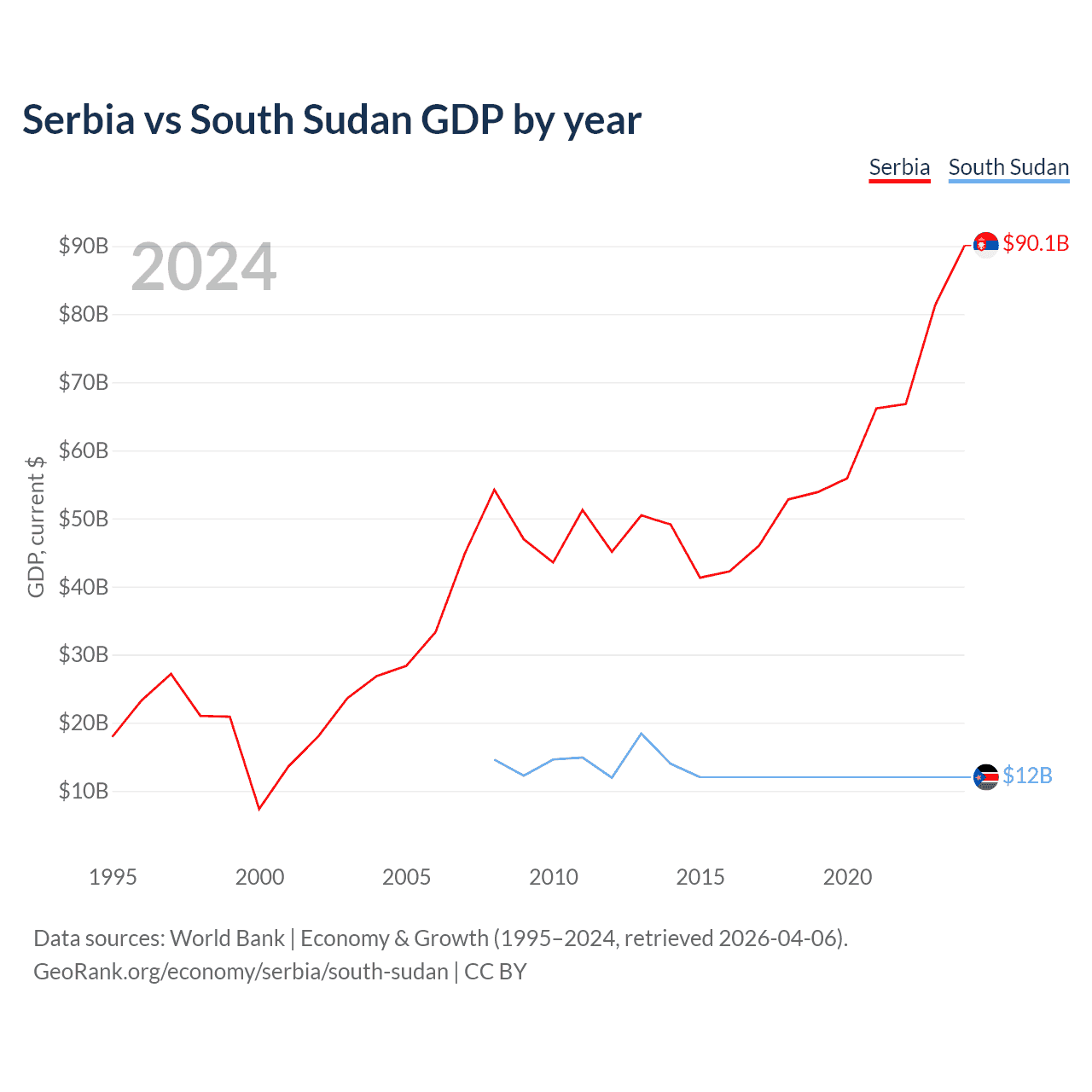 Serbia has a GDP of $90.1B compared to $12B for South Sudan, ranking 76/197 and 149/197 by economy size, respectively.