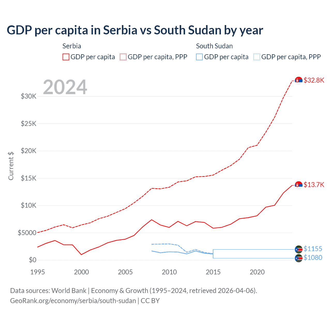 Serbia's GDP per capita is $13,679, ranking 73/197, compared to $1,080 in South Sudan, ranking 175/197. Adjusted for purchasing power (GDP per capita PPP), Serbia ranks 69th at $32,832, while South Sudan ranks 197th at $1,155.