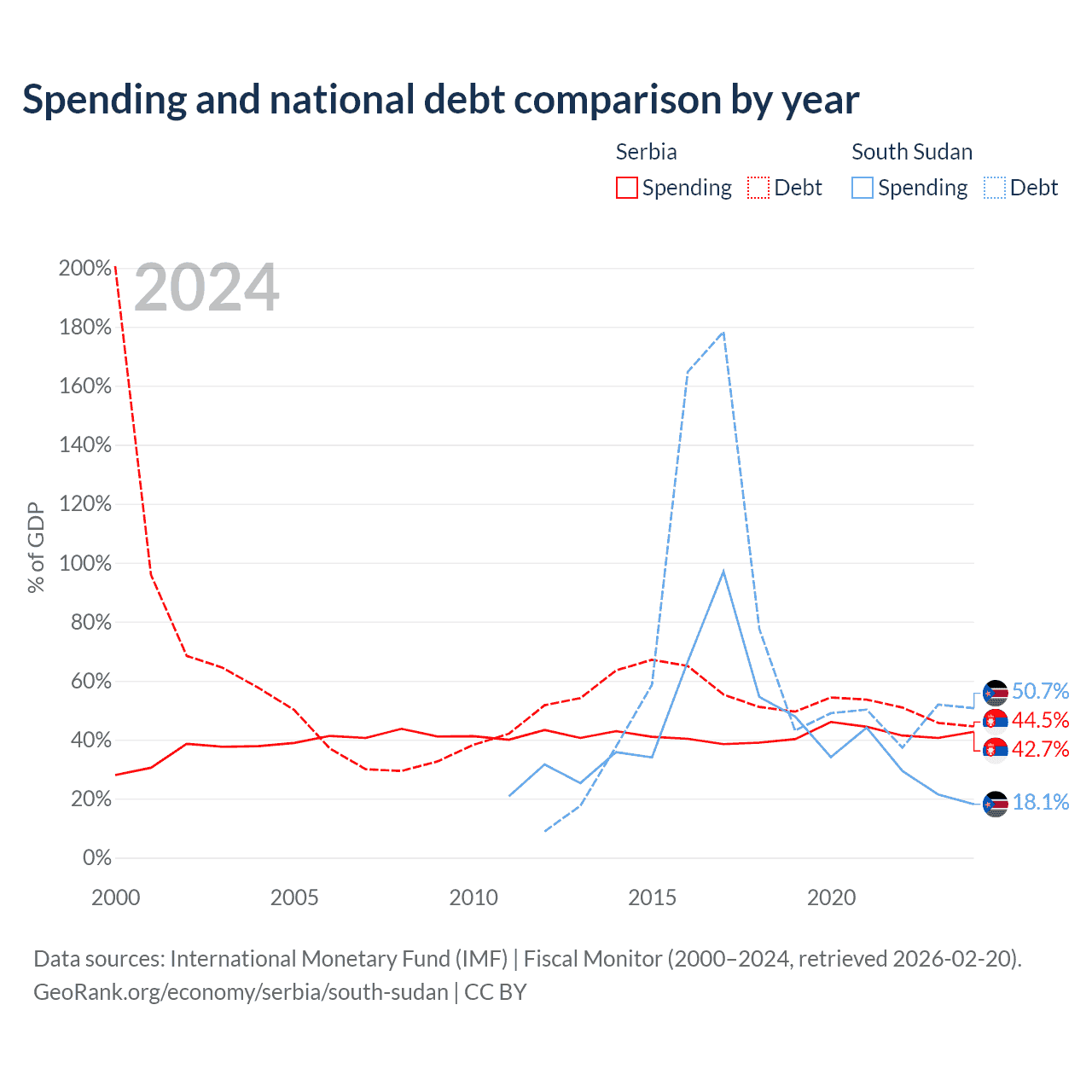 Serbia has $40.1B in government debt (44.5% of GDP), compared to $7.04B (50.7% of GDP) in South Sudan.