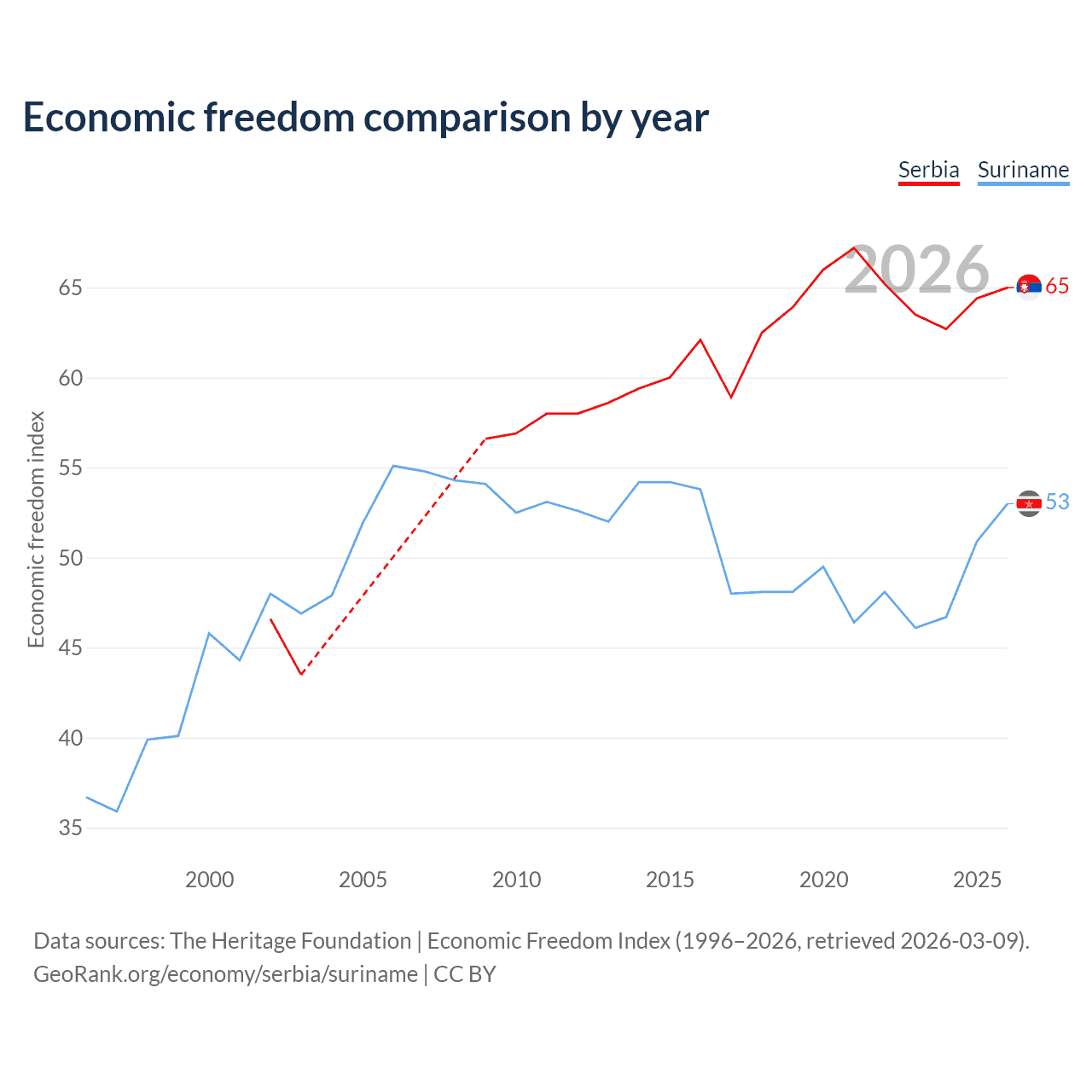The Economic Freedom Index for Serbia is 65, ranking 68/197, compared to 53 for Suriname, ranking 143/197. The chart above displays a comparison of annual changes in economic freedom indexes.
