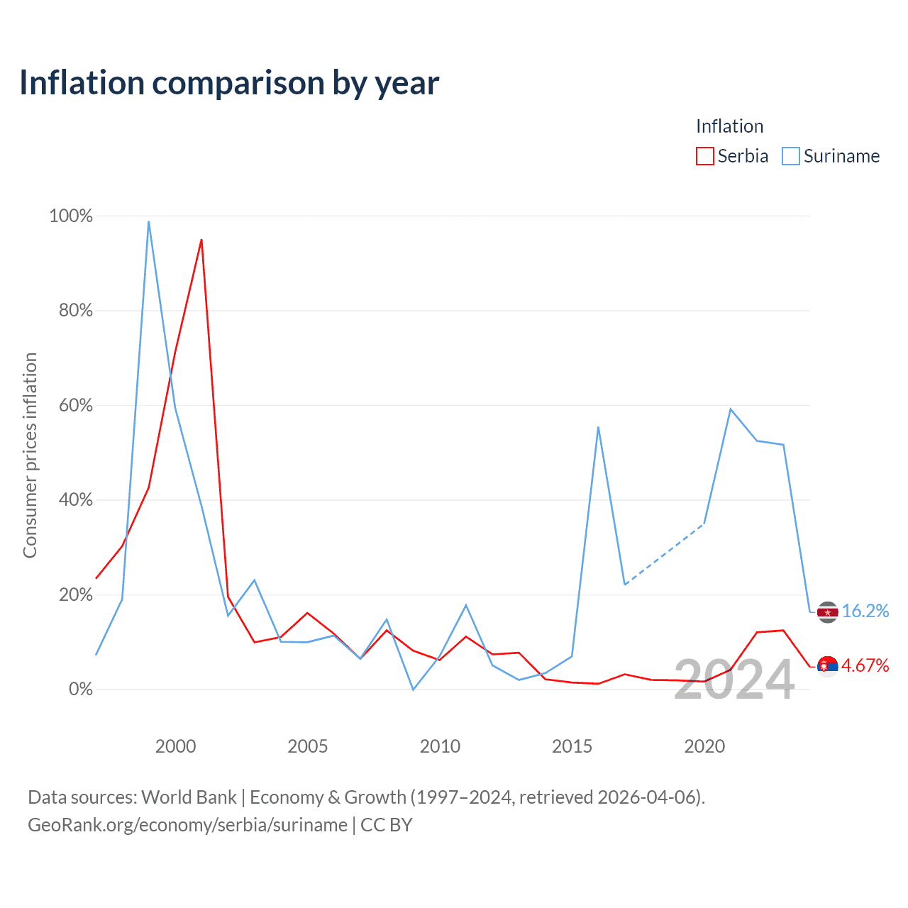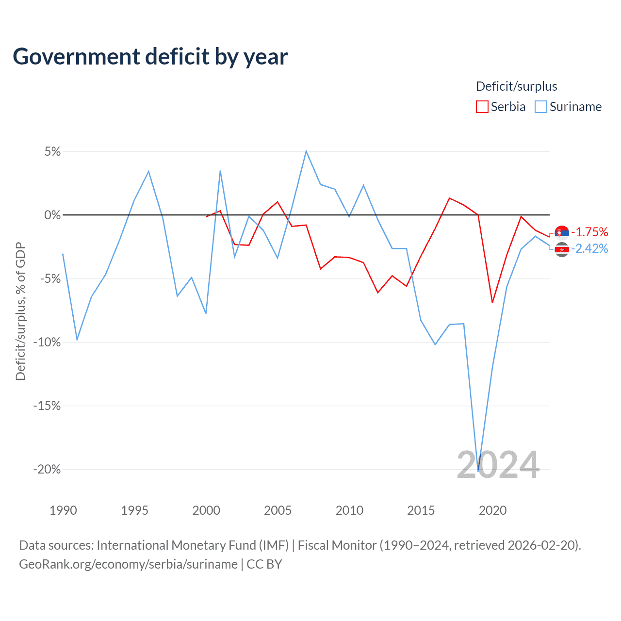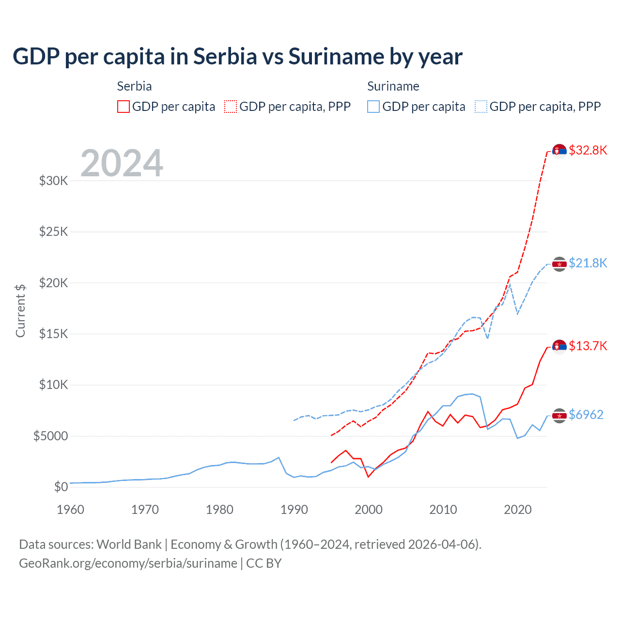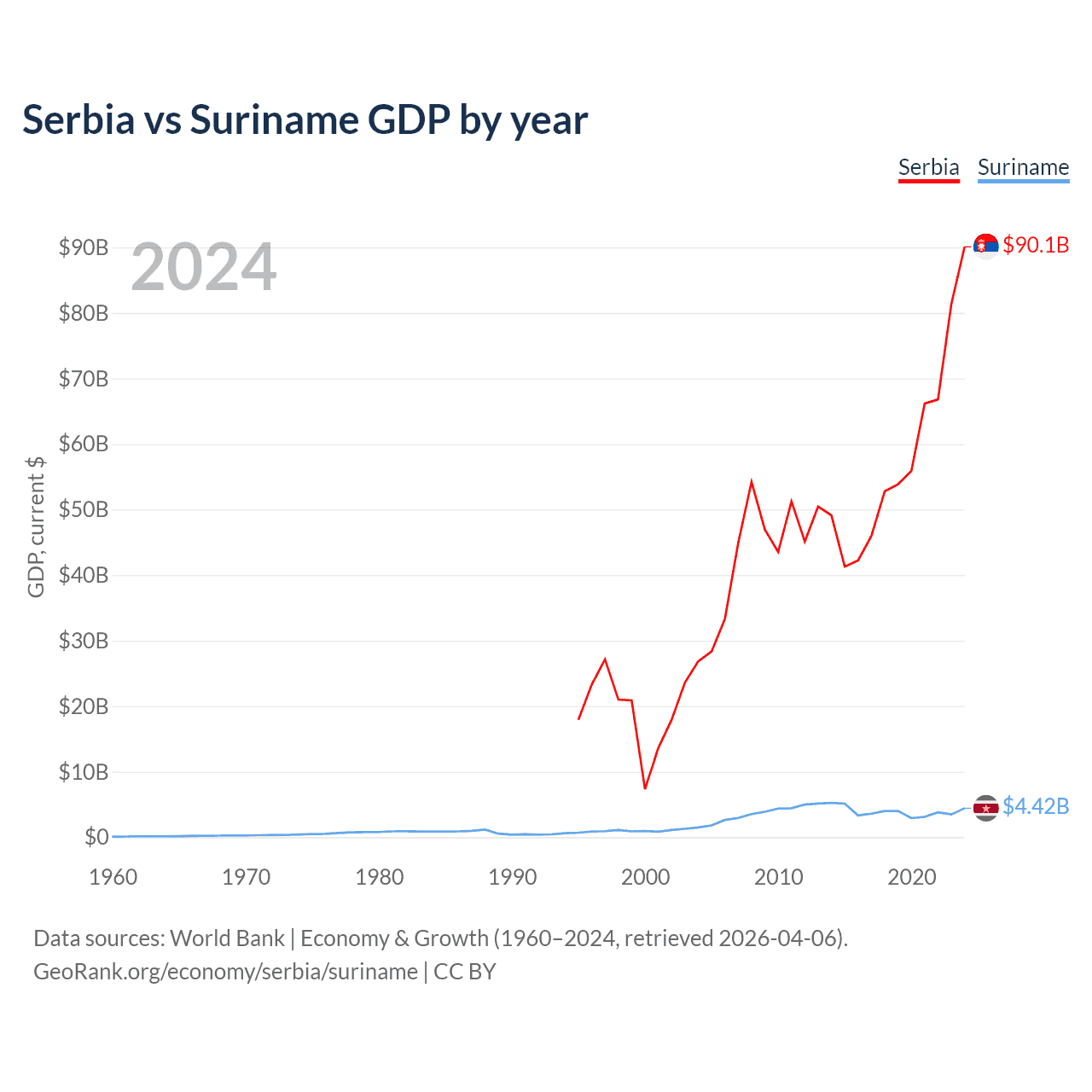 Serbia has a GDP of $90.1B compared to $4.42B for Suriname, ranking 76/197 and 164/197 by economy size, respectively.