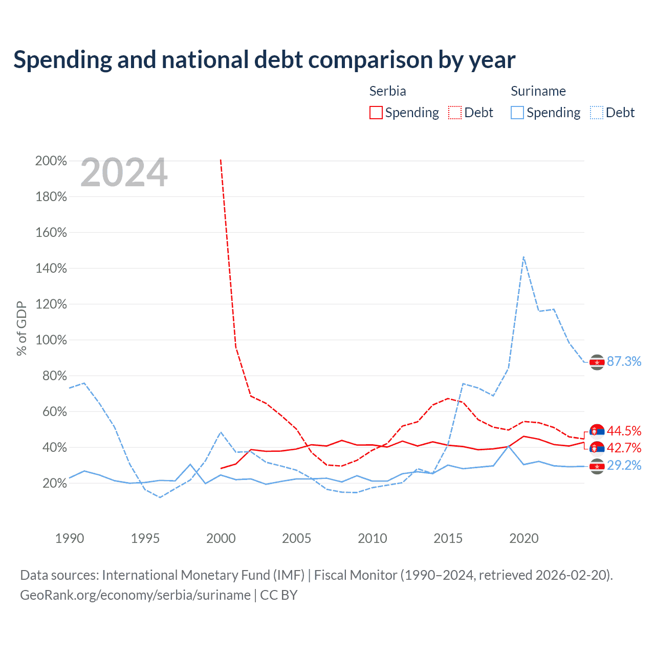 Serbia has $40.1B in government debt (44.5% of GDP), compared to $3.86B (87.3% of GDP) in Suriname.