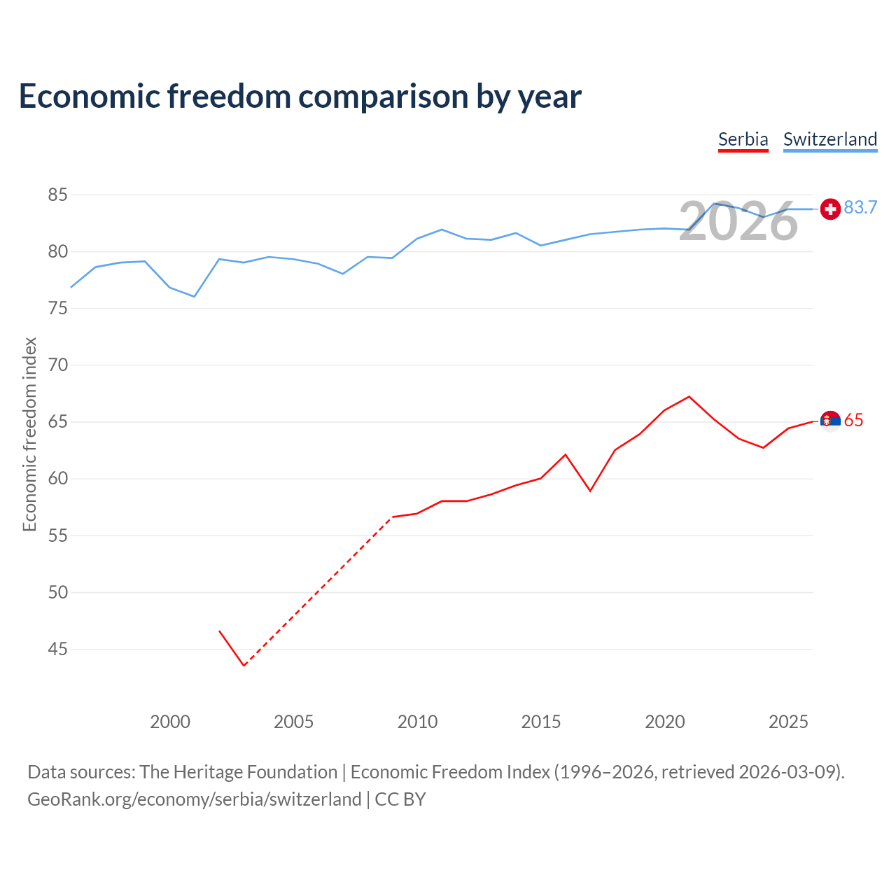The Economic Freedom Index for Serbia is 65, ranking 68/197, compared to 83.7 for Switzerland, ranking 2/197. The chart above displays a comparison of annual changes in economic freedom indexes.