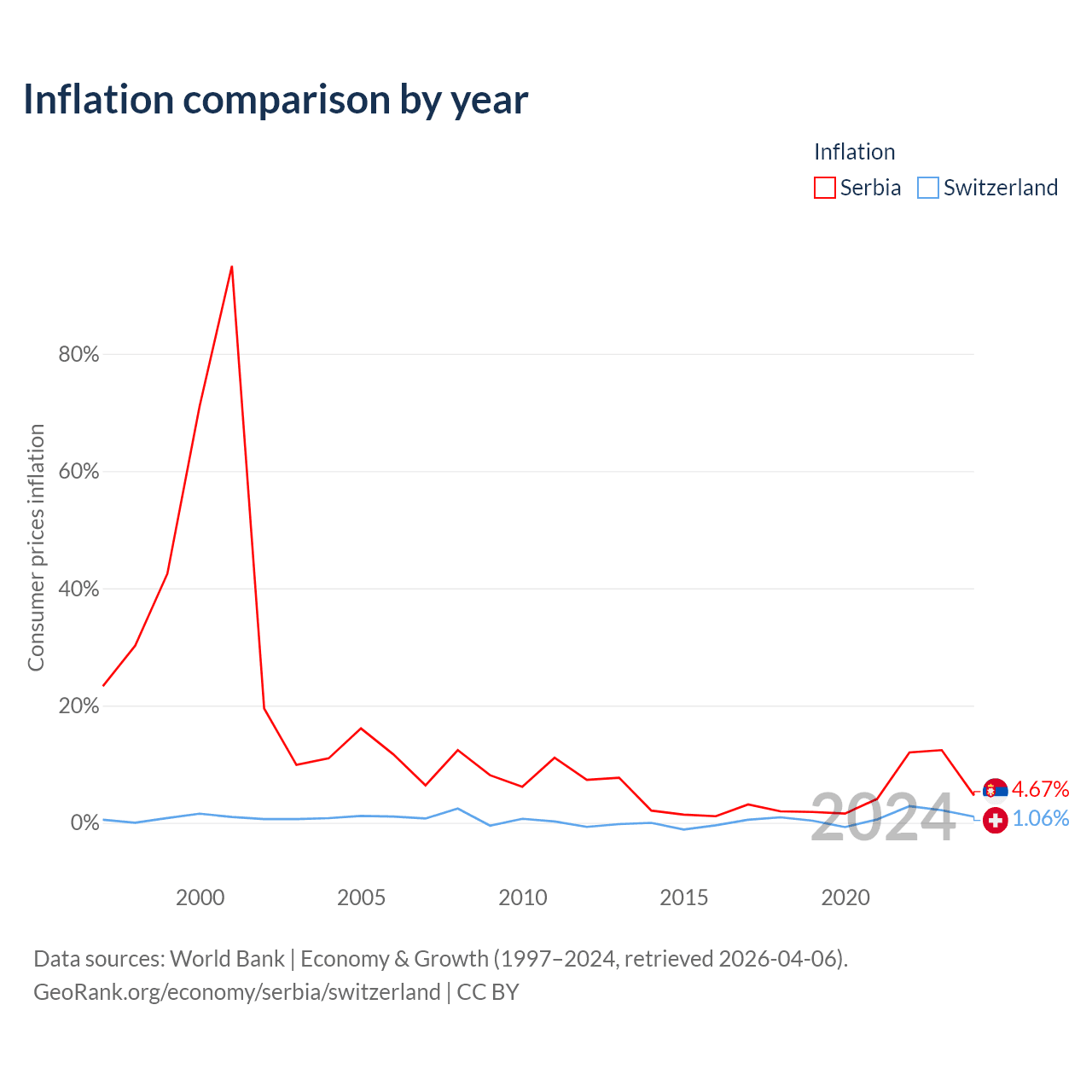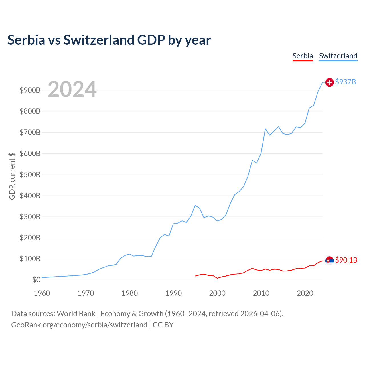 Serbia has a GDP of $90.1B compared to $937B for Switzerland, ranking 76/197 and 20/197 by economy size, respectively.