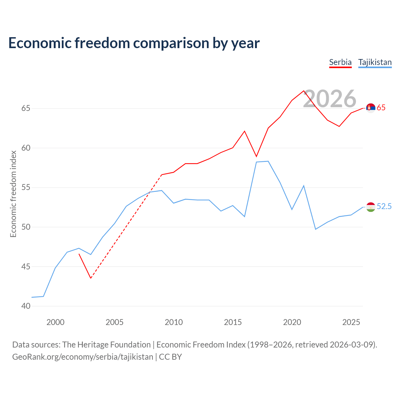 The Economic Freedom Index for Serbia is 65, ranking 68/197, compared to 52.5 for Tajikistan, ranking 147/197. The chart above displays a comparison of annual changes in economic freedom indexes.