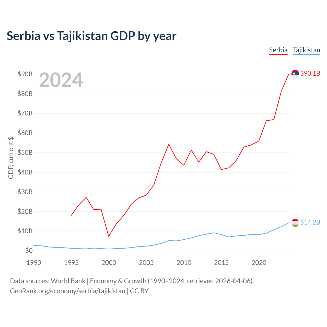Serbia has a GDP of $90.1B compared to $14.2B for Tajikistan, ranking 76/197 and 145/197 by economy size, respectively.