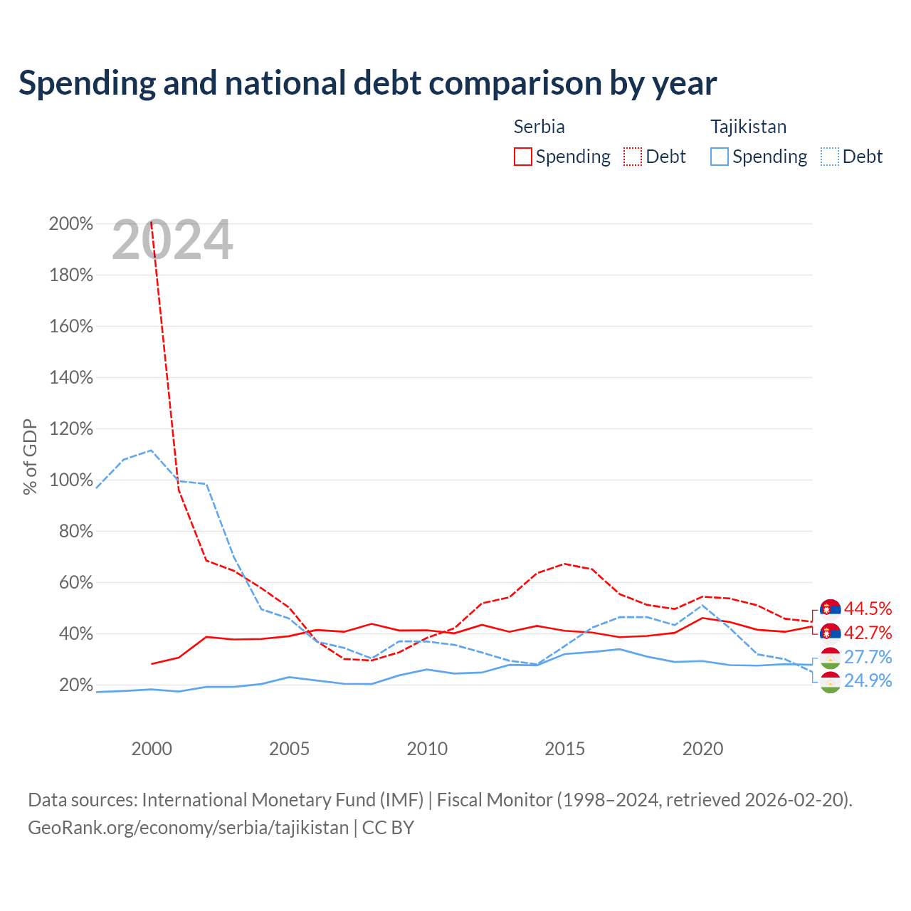 Serbia has $40.1B in government debt (44.5% of GDP), compared to $3.54B (24.9% of GDP) in Tajikistan.
