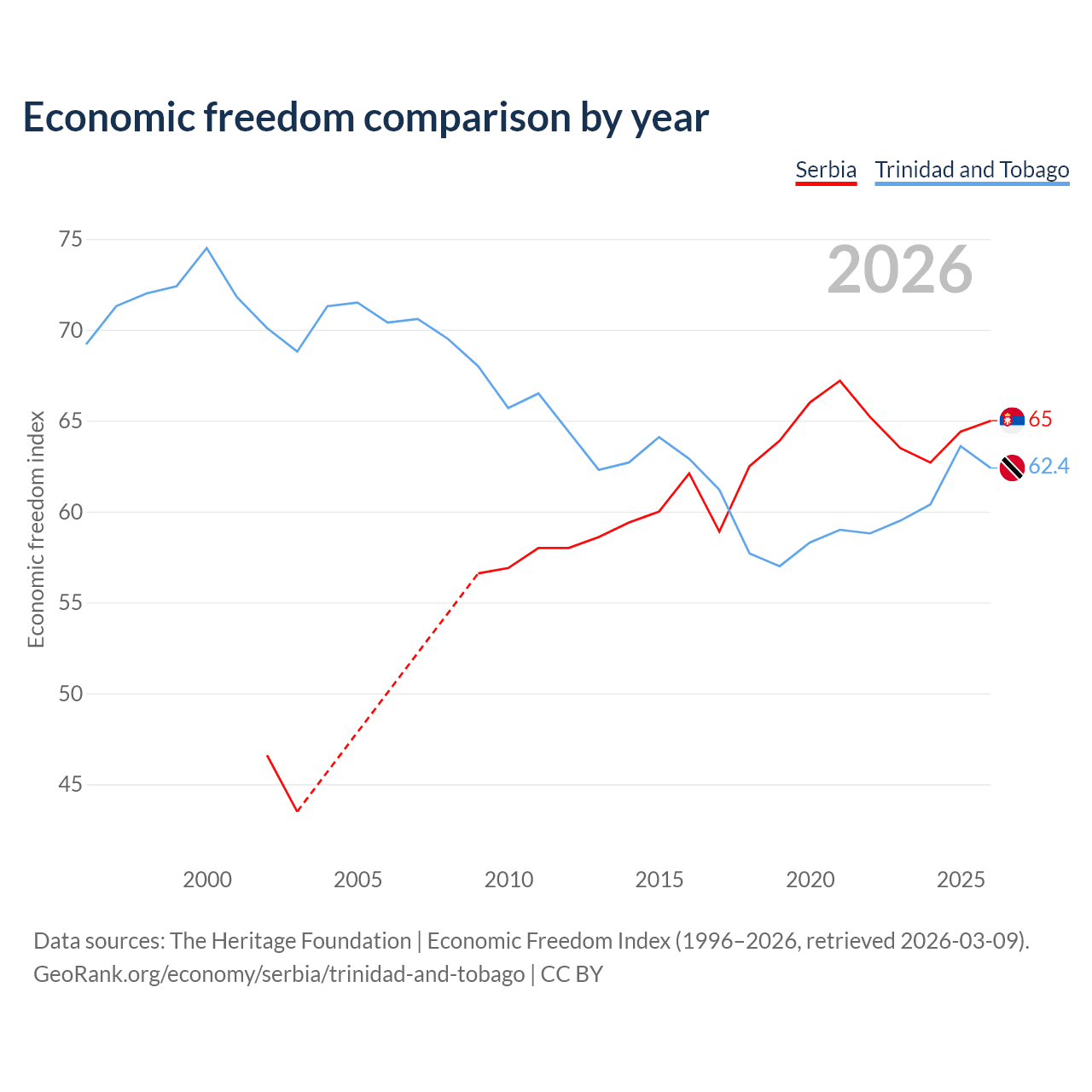 The Economic Freedom Index for Serbia is 65, ranking 68/197, compared to 62.4 for Trinidad and Tobago, ranking 87/197. The chart above displays a comparison of annual changes in economic freedom indexes.
