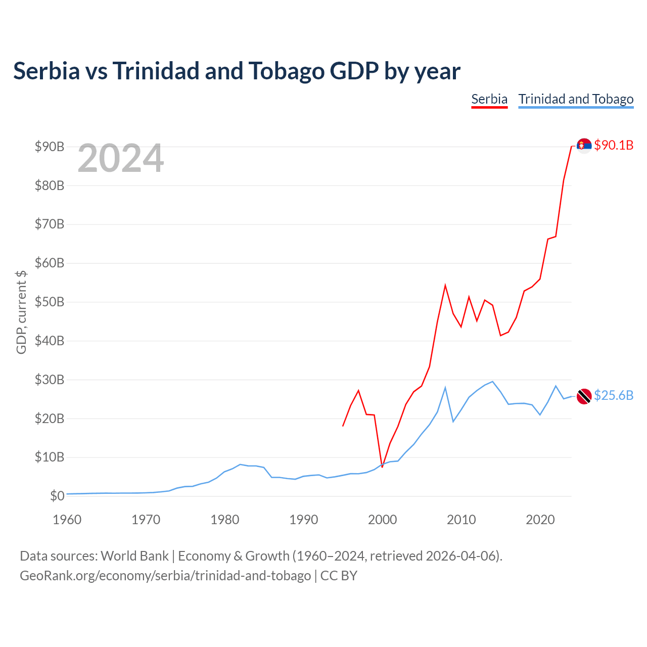 Serbia has a GDP of $90.1B compared to $25.6B for Trinidad and Tobago, ranking 76/197 and 115/197 by economy size, respectively.