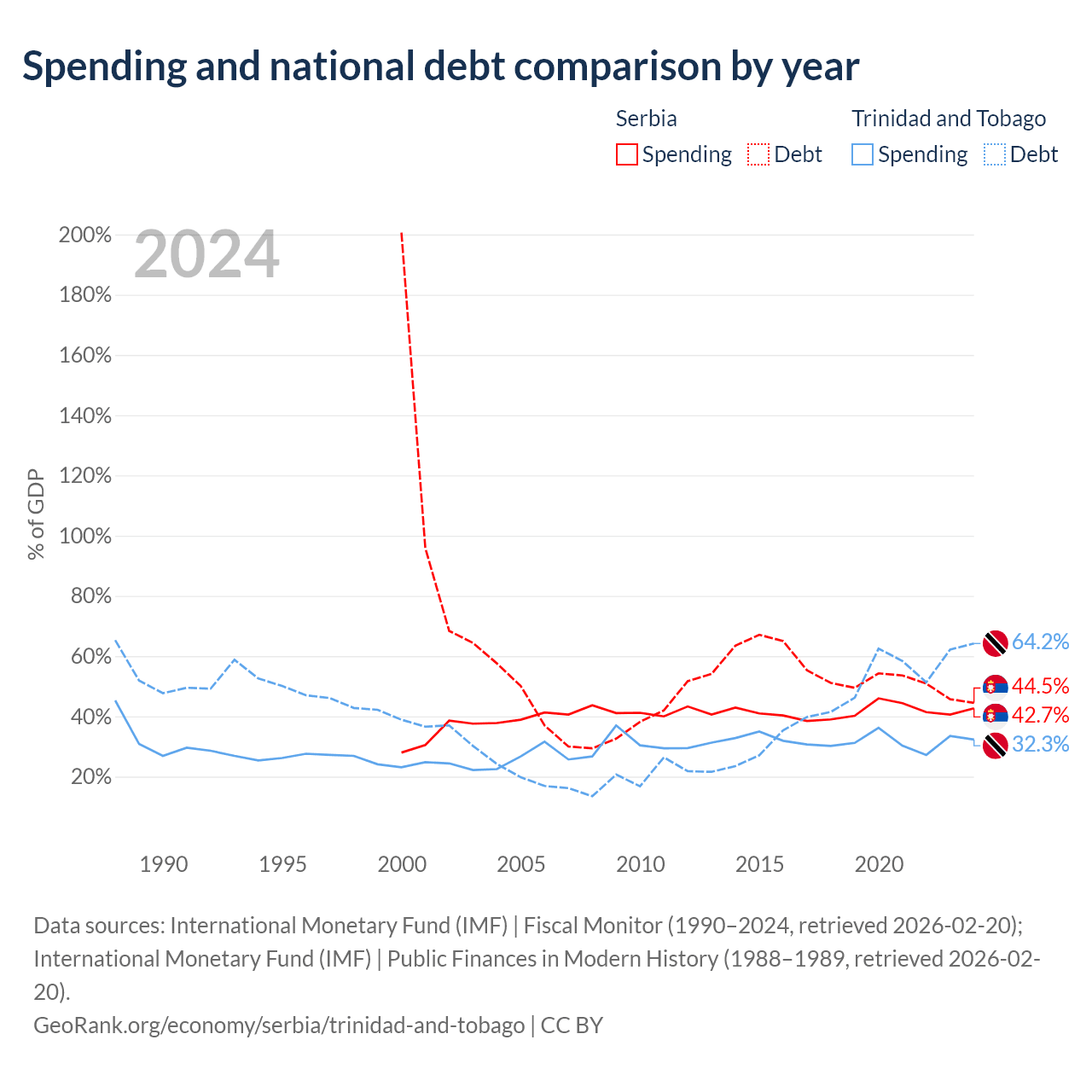 Serbia has $40.1B in government debt (44.5% of GDP), compared to $16.5B (64.2% of GDP) in Trinidad and Tobago.