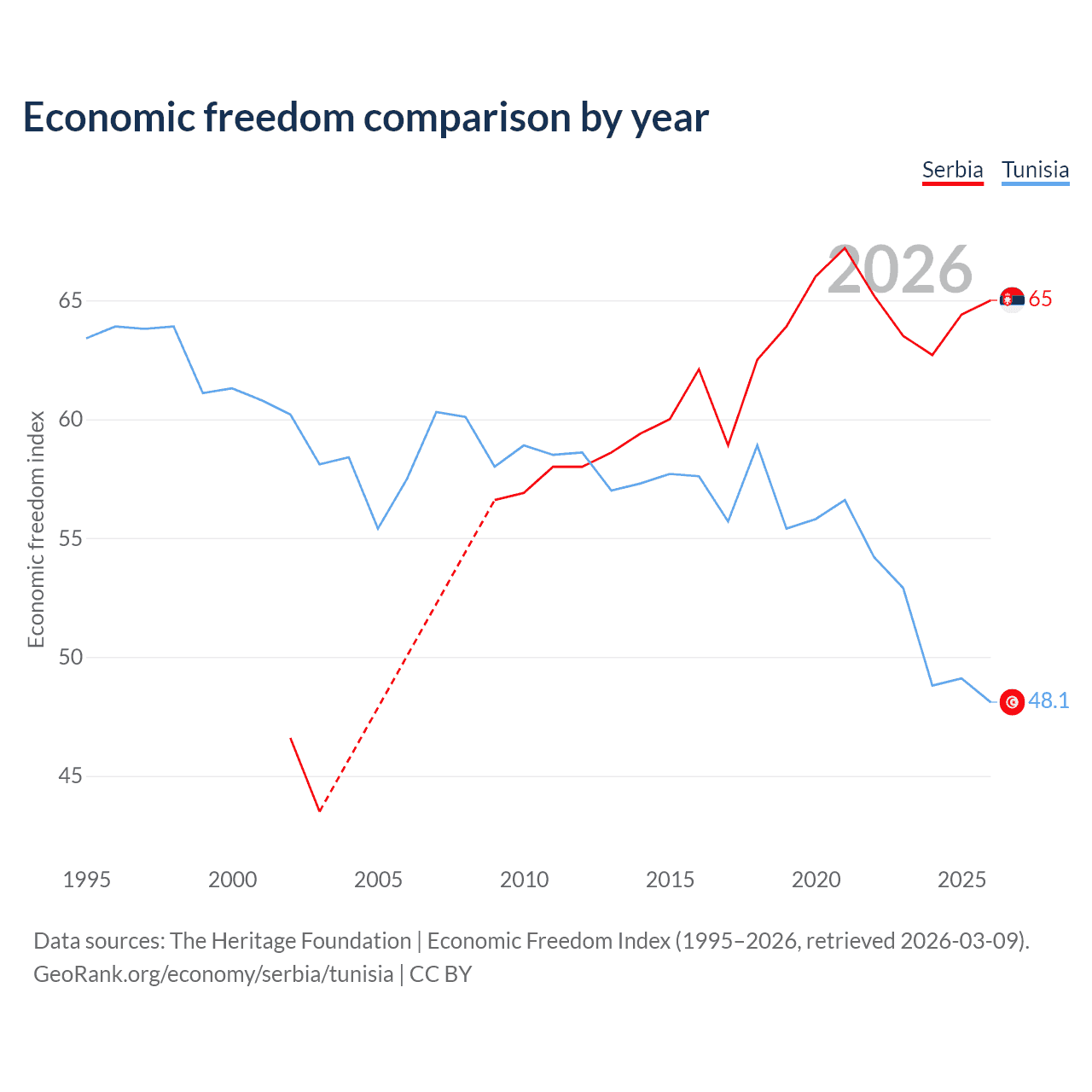 The Economic Freedom Index for Serbia is 65, ranking 68/197, compared to 48.1 for Tunisia, ranking 172/197. The chart above displays a comparison of annual changes in economic freedom indexes.
