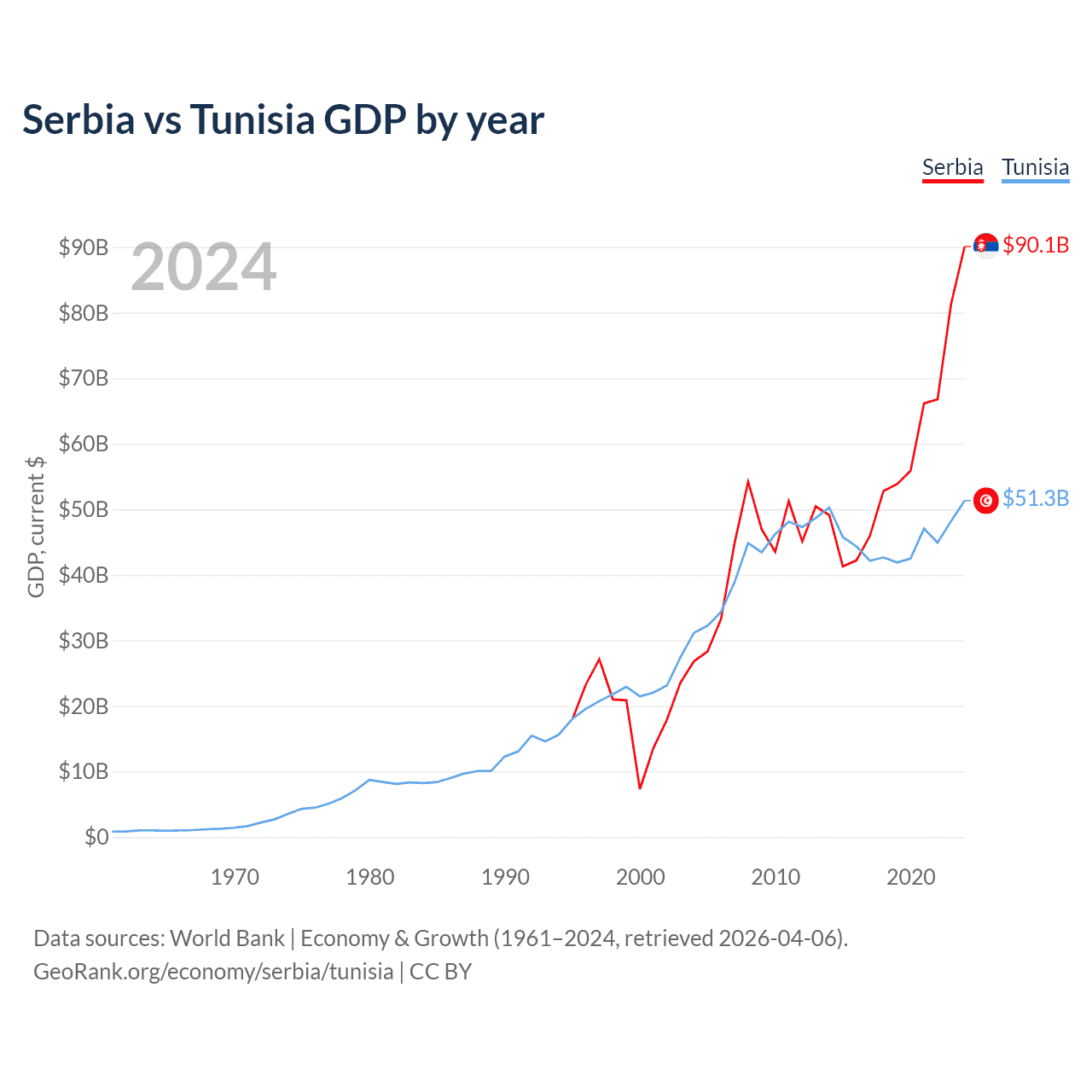 Serbia has a GDP of $90.1B compared to $51.3B for Tunisia, ranking 76/197 and 93/197 by economy size, respectively.