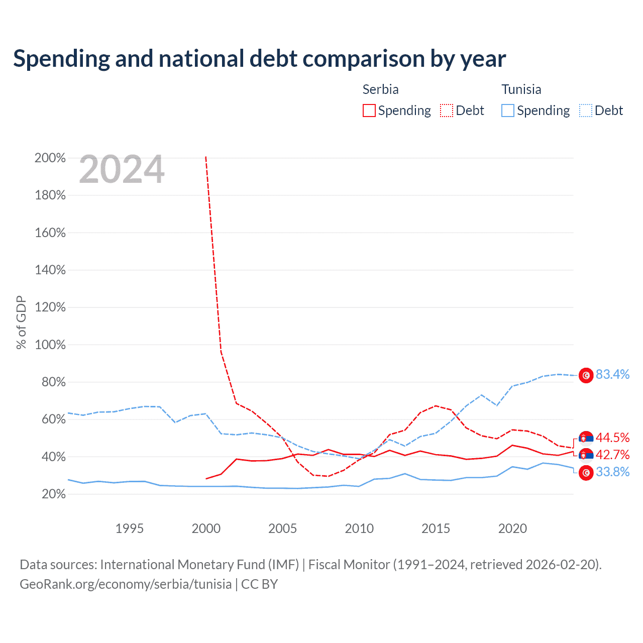 Serbia has $40.1B in government debt (44.5% of GDP), compared to $42.8B (83.4% of GDP) in Tunisia.
