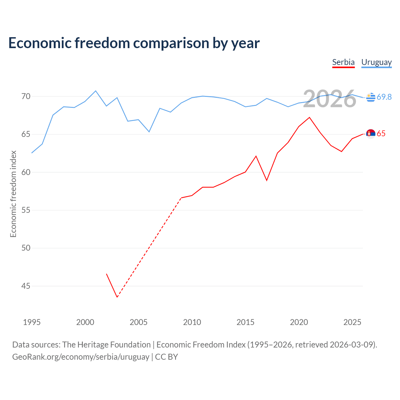 The Economic Freedom Index for Serbia is 65, ranking 68/197, compared to 69.8 for Uruguay, ranking 39/197. The chart above displays a comparison of annual changes in economic freedom indexes.