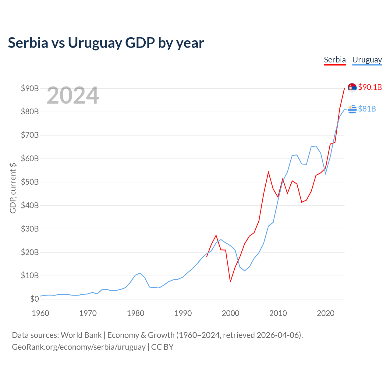 Serbia vs Uruguay GDP by year