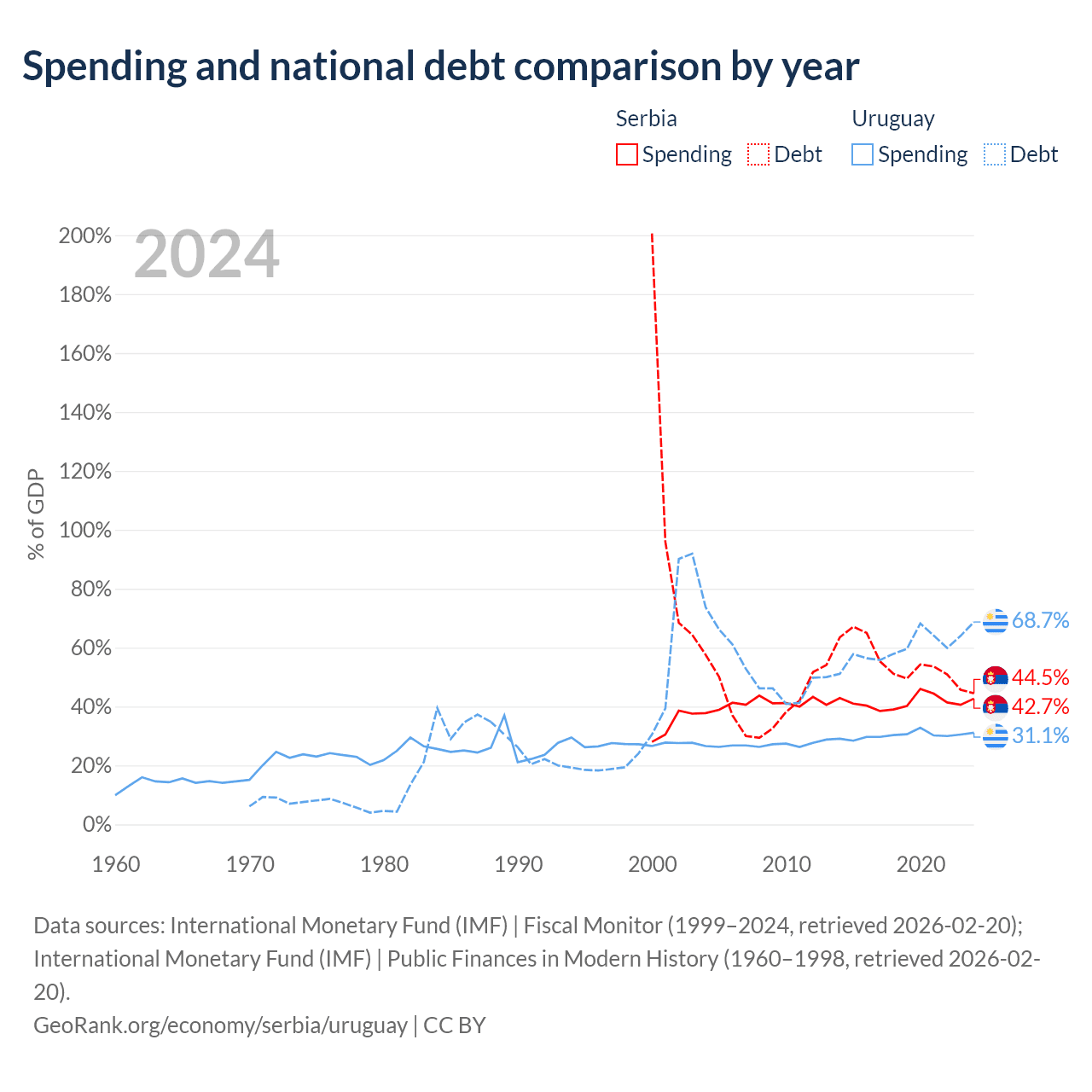 Serbia has $40.1B in government debt (44.5% of GDP), compared to $55.6B (68.7% of GDP) in Uruguay.