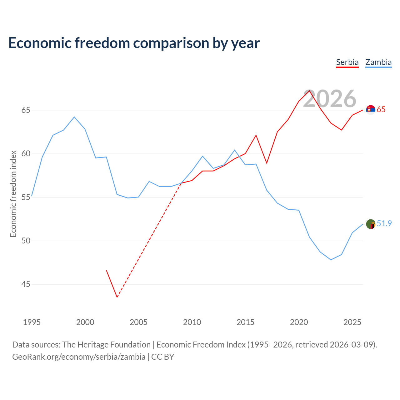 The Economic Freedom Index for Serbia is 65, ranking 68/197, compared to 51.9 for Zambia, ranking 152/197. The chart above displays a comparison of annual changes in economic freedom indexes.