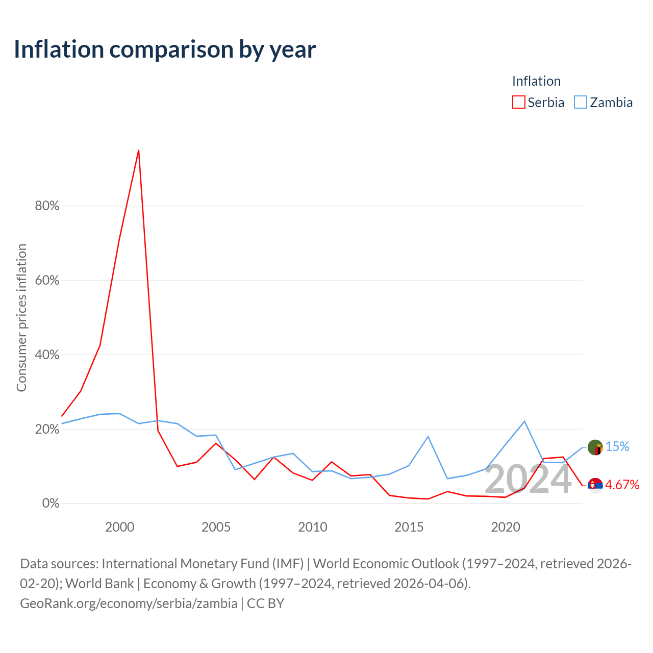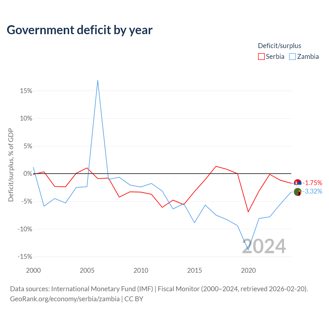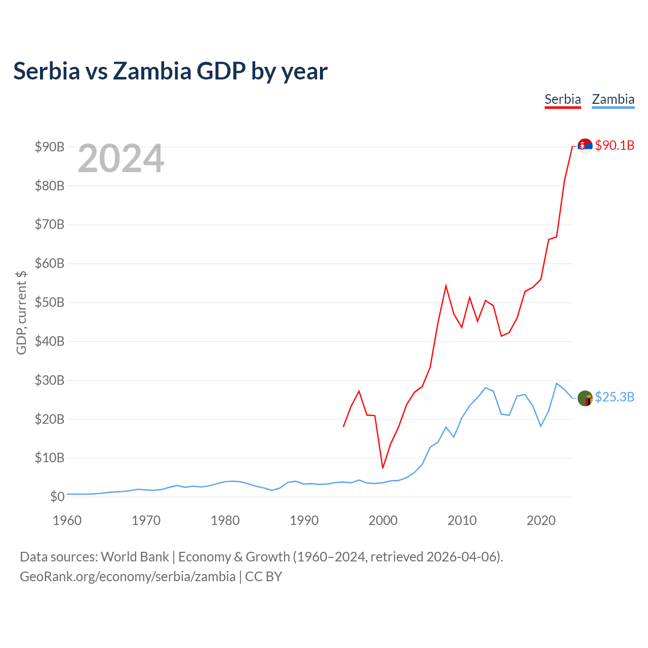 Serbia has a GDP of $90.1B compared to $25.3B for Zambia, ranking 76/197 and 116/197 by economy size, respectively.