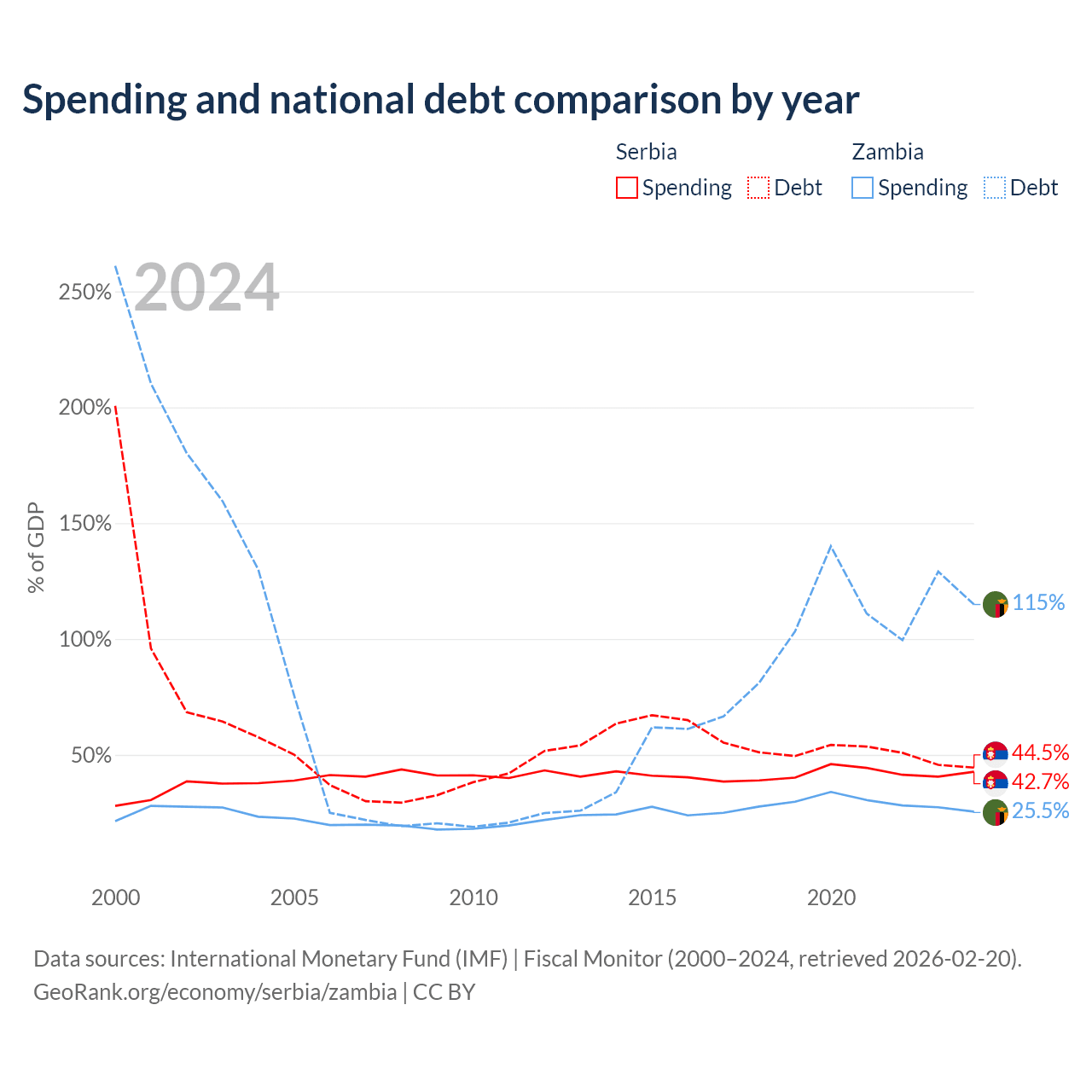 Serbia has $40.1B in government debt (44.5% of GDP), compared to $29.1B (114.9% of GDP) in Zambia.