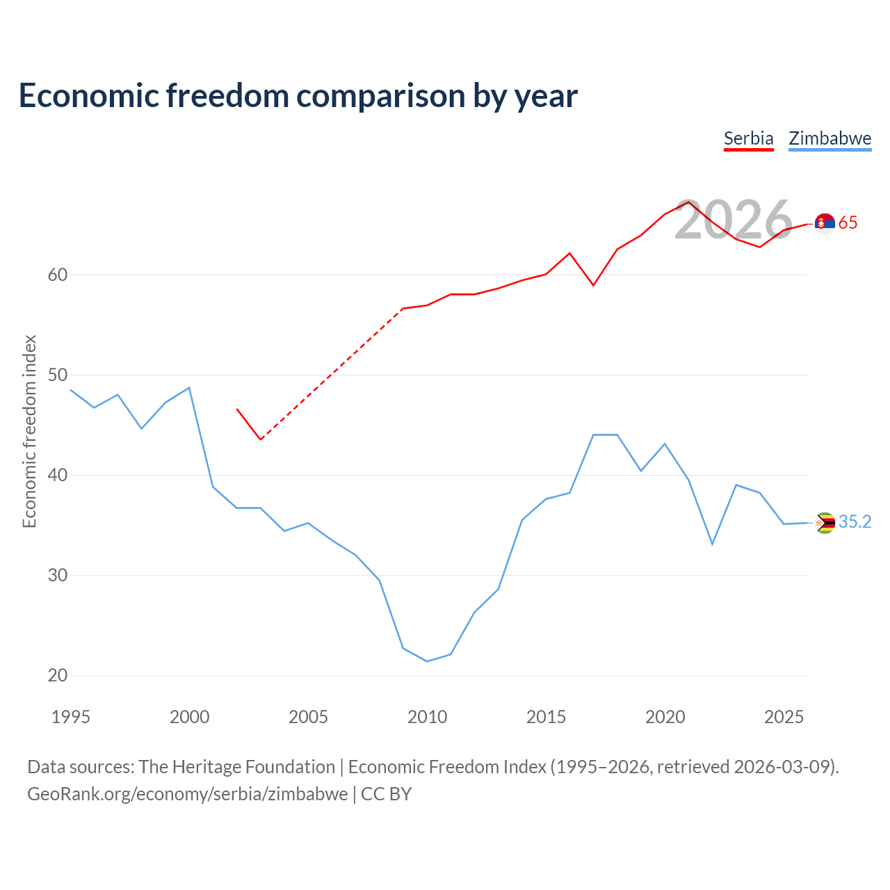 The Economic Freedom Index for Serbia is 65, ranking 68/197, compared to 35.2 for Zimbabwe, ranking 190/197. The chart above displays a comparison of annual changes in economic freedom indexes.