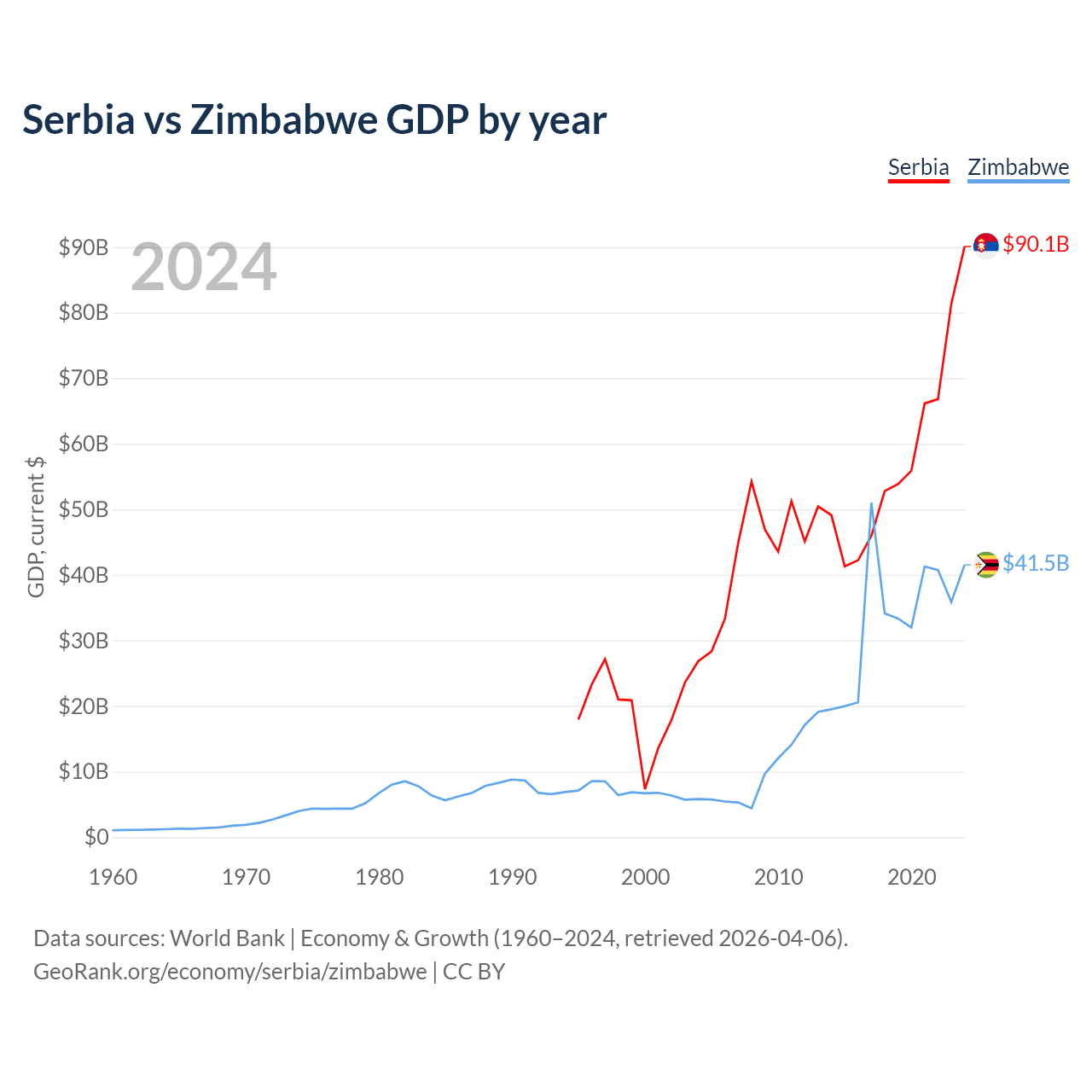 Serbia has a GDP of $90.1B compared to $41.5B for Zimbabwe, ranking 76/197 and 102/197 by economy size, respectively.