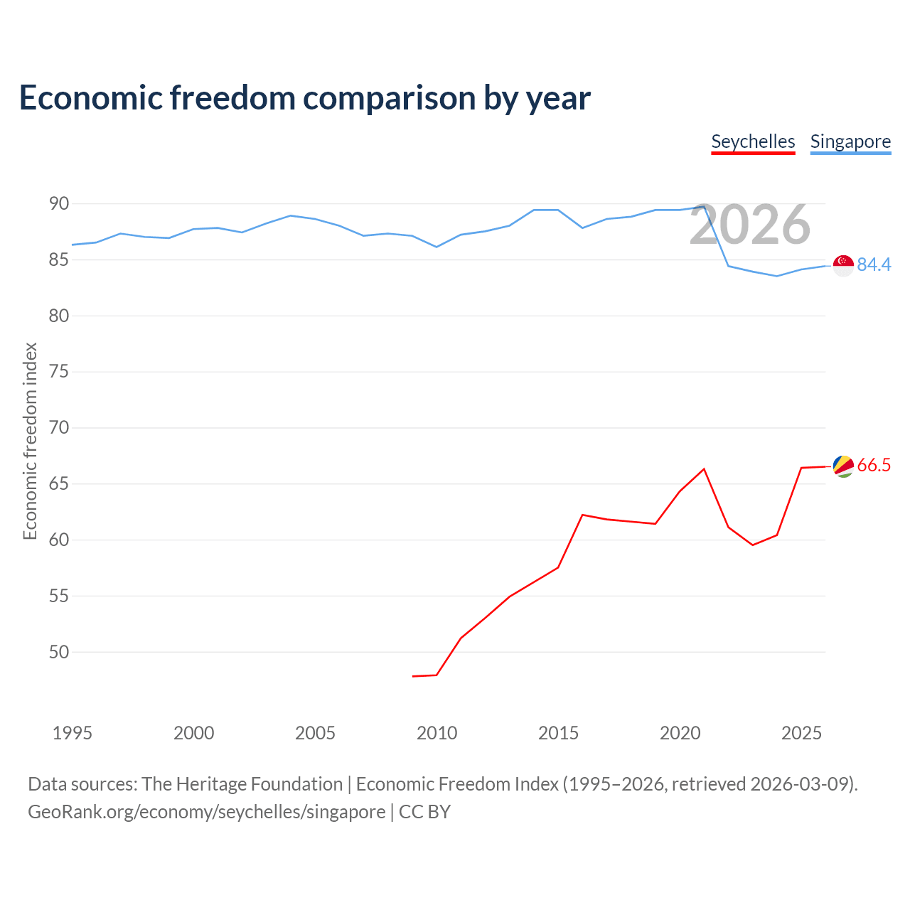 The Economic Freedom Index for the Seychelles is 66.5, ranking 60/197, compared to 84.4 for Singapore, ranking 1/197. The chart above displays a comparison of annual changes in economic freedom indexes.