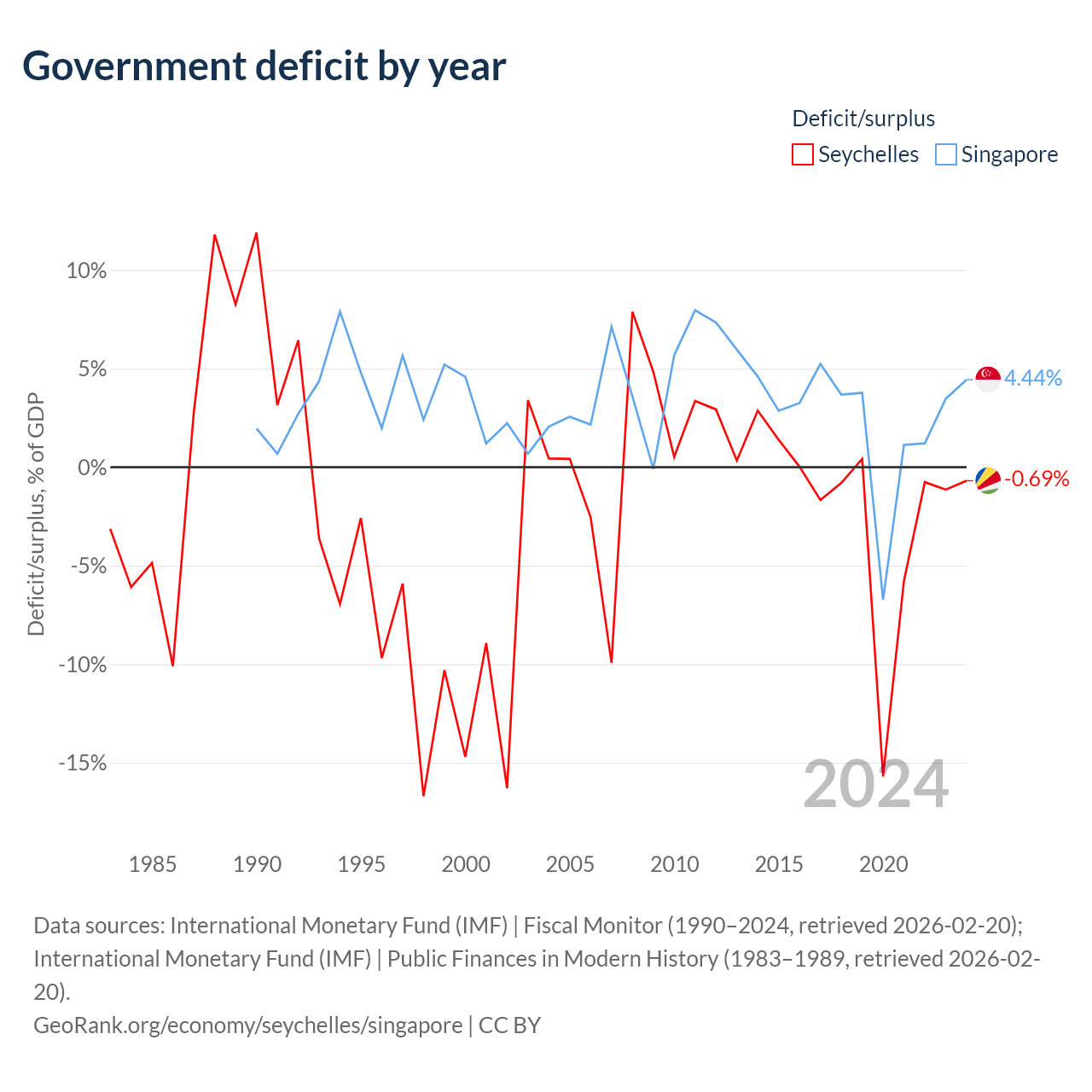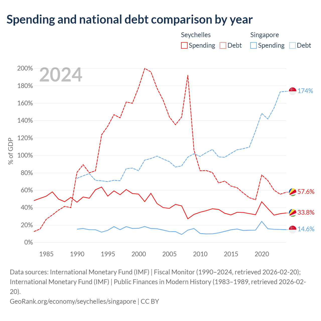 The Seychelles has $1.25B in government debt (57.6% of GDP), compared to $950B (173.5% of GDP) in Singapore.