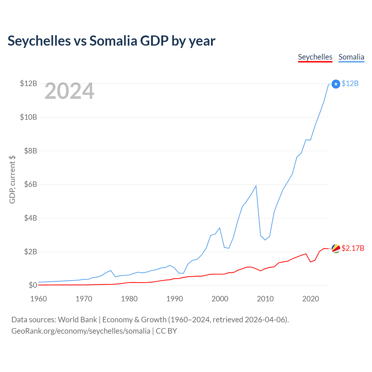 The Seychelles has a GDP of $2.17B compared to $12B for Somalia, ranking 178/197 and 150/197 by economy size, respectively.