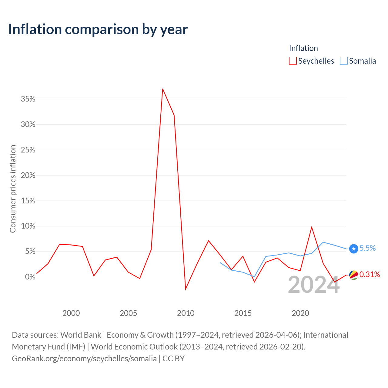 Over the past 12 years, the Seychelles has recorded an average annual inflation rate of 2.5%, compared with 3.77% in Somalia. In 2024, inflation was 0.31% in the Seychelles and 5.5% in Somalia.