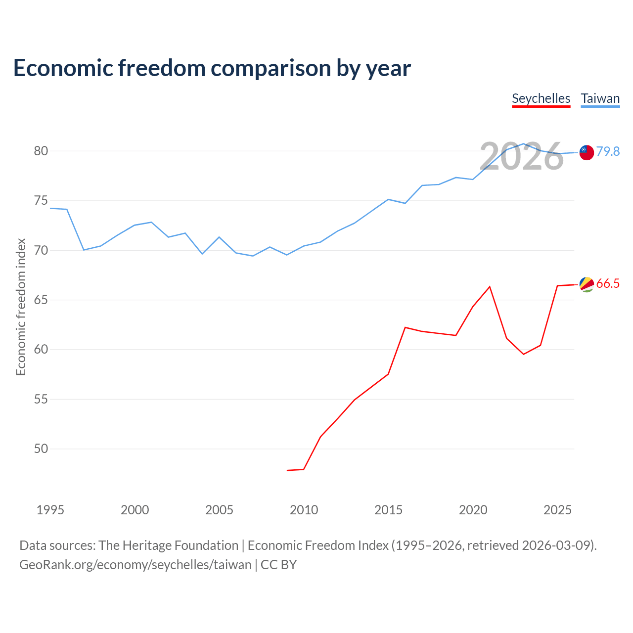 The Economic Freedom Index for the Seychelles is 66.5, ranking 60/197, compared to 79.8 for Taiwan, ranking 6/197. The chart above displays a comparison of annual changes in economic freedom indexes.