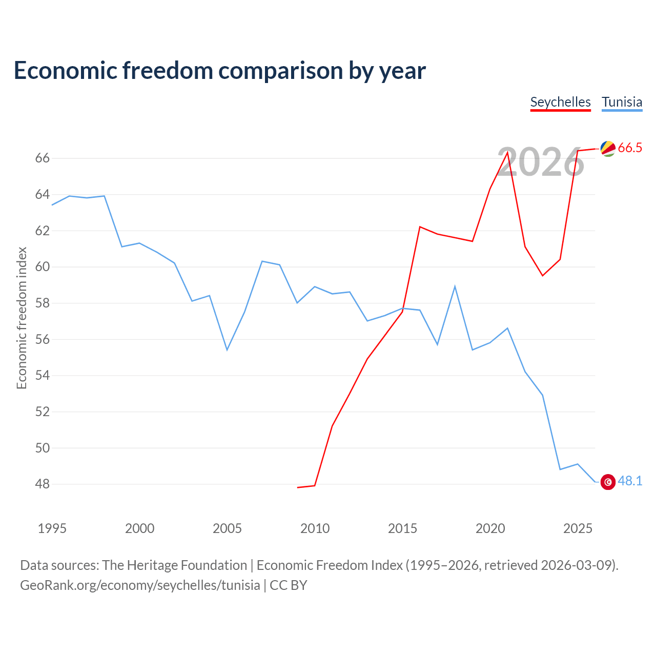 The Economic Freedom Index for the Seychelles is 66.5, ranking 60/197, compared to 48.1 for Tunisia, ranking 172/197. The chart above displays a comparison of annual changes in economic freedom indexes.