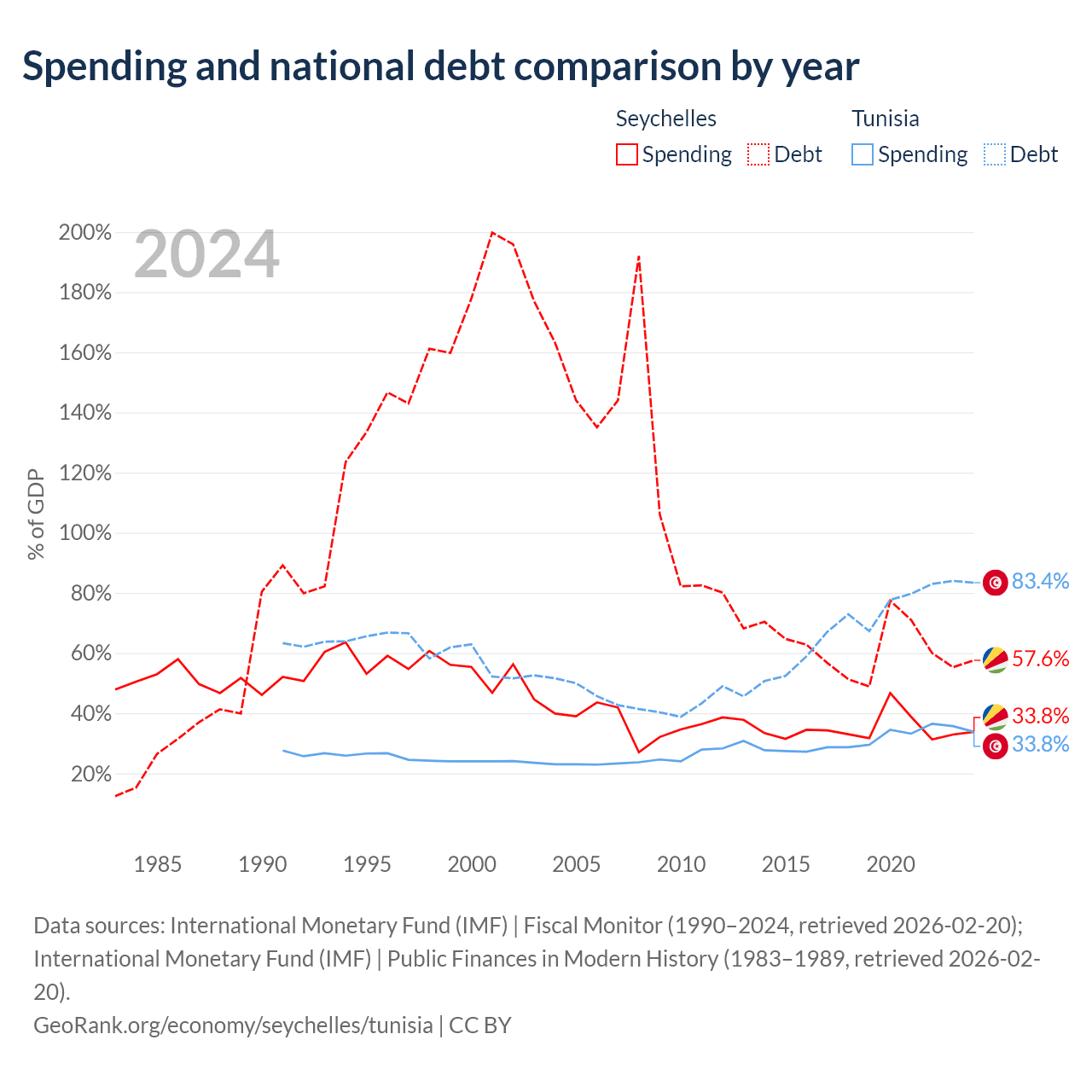 The Seychelles has $1.25B in government debt (57.6% of GDP), compared to $42.8B (83.4% of GDP) in Tunisia.