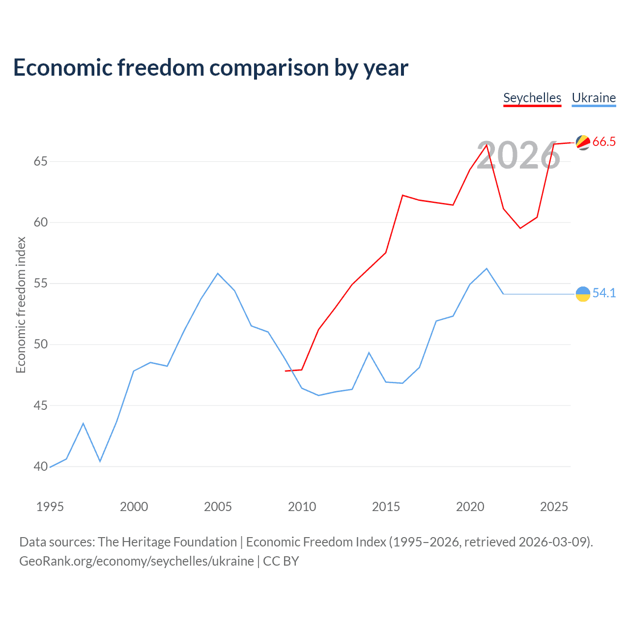 The Economic Freedom Index for the Seychelles is 66.5, ranking 60/197, compared to 54.1 for Ukraine, ranking 135/197. The chart above displays a comparison of annual changes in economic freedom indexes.
