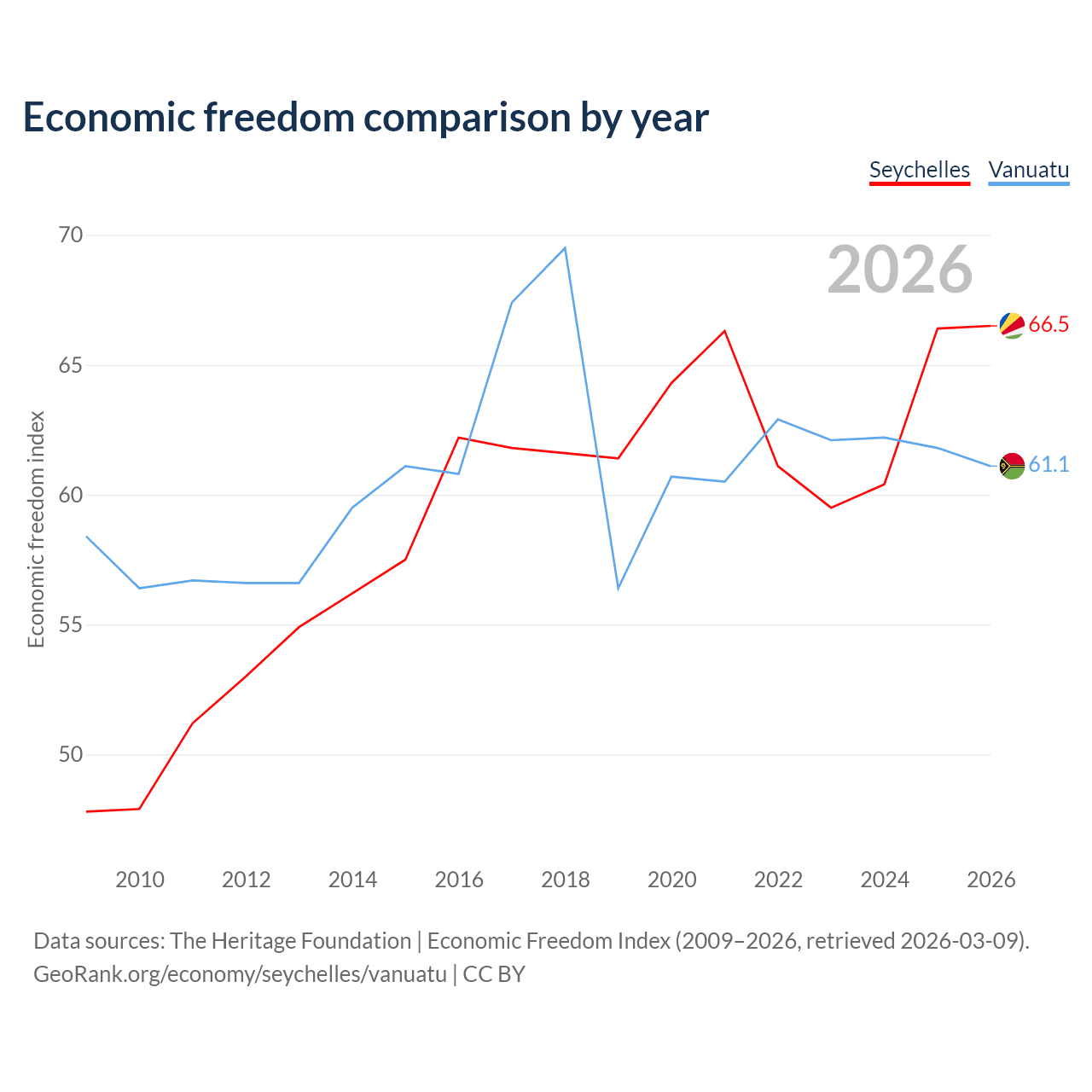 The Economic Freedom Index for the Seychelles is 66.5, ranking 60/197, compared to 61.1 for Vanuatu, ranking 92/197. The chart above displays a comparison of annual changes in economic freedom indexes.