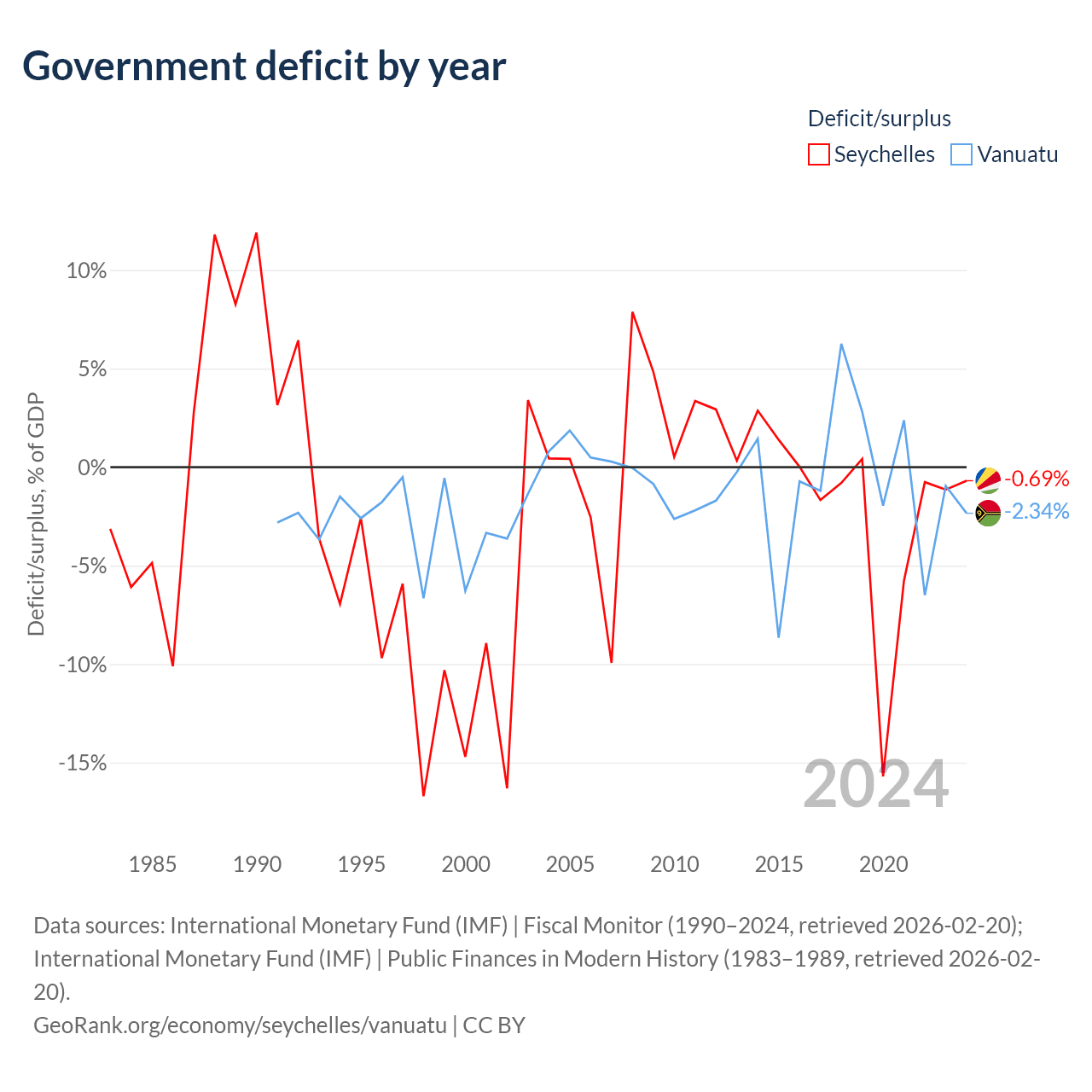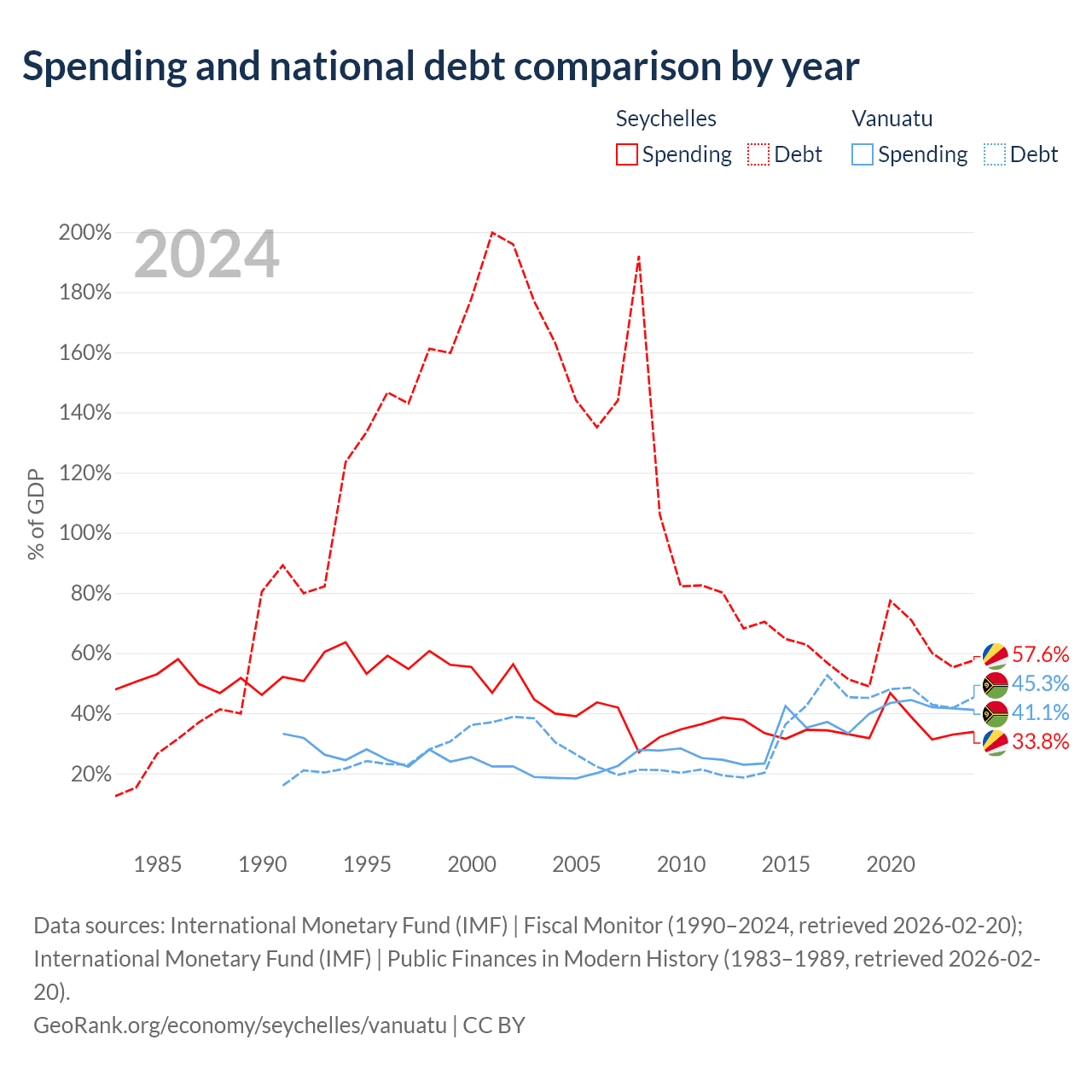 The Seychelles has $1.25B in government debt (57.6% of GDP), compared to $507M (45.3% of GDP) in Vanuatu.