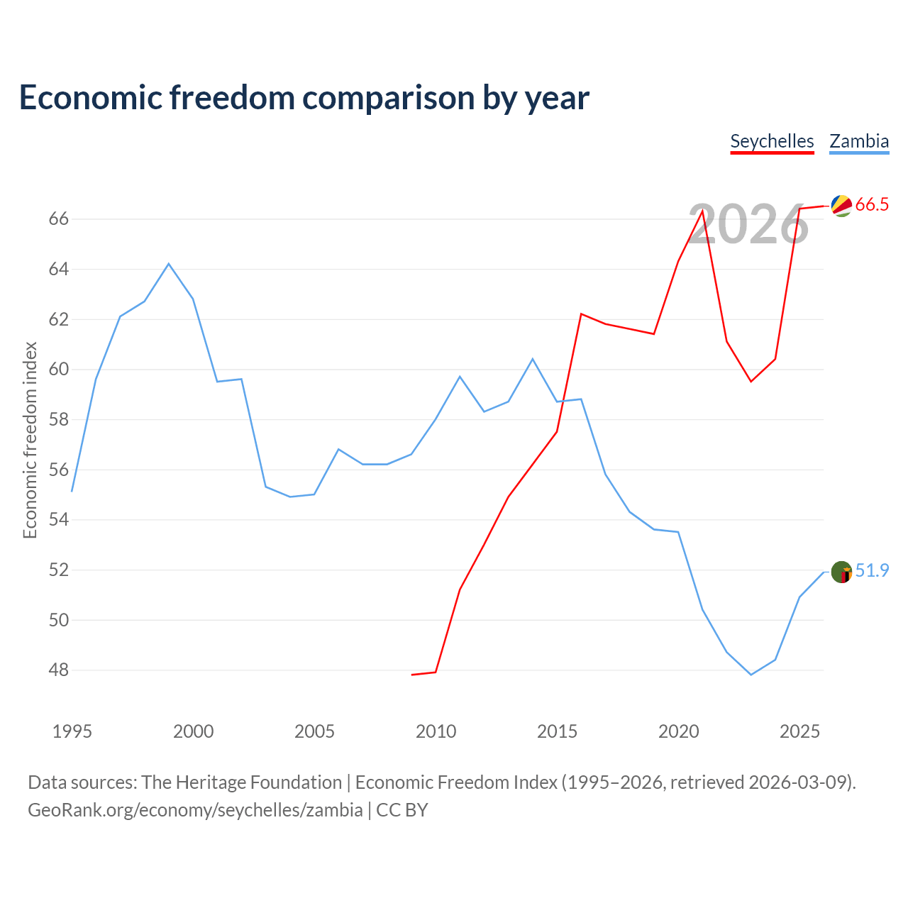 The Economic Freedom Index for the Seychelles is 66.5, ranking 60/197, compared to 51.9 for Zambia, ranking 152/197. The chart above displays a comparison of annual changes in economic freedom indexes.