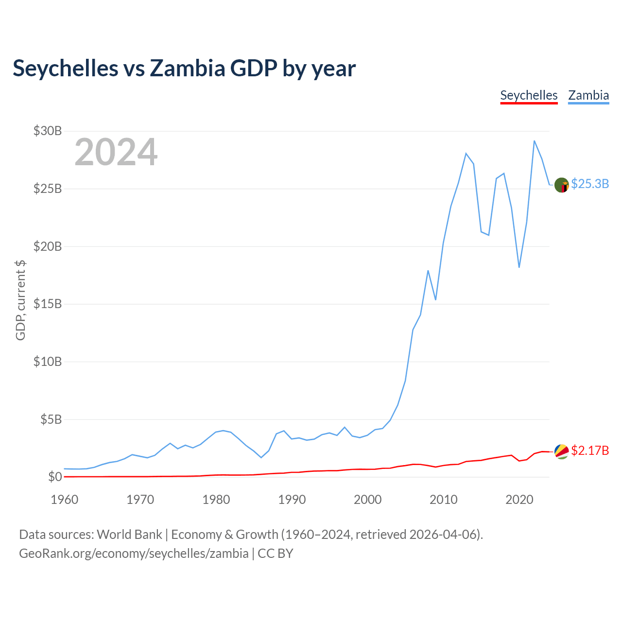 The Seychelles has a GDP of $2.17B compared to $25.3B for Zambia, ranking 178/197 and 116/197 by economy size, respectively.