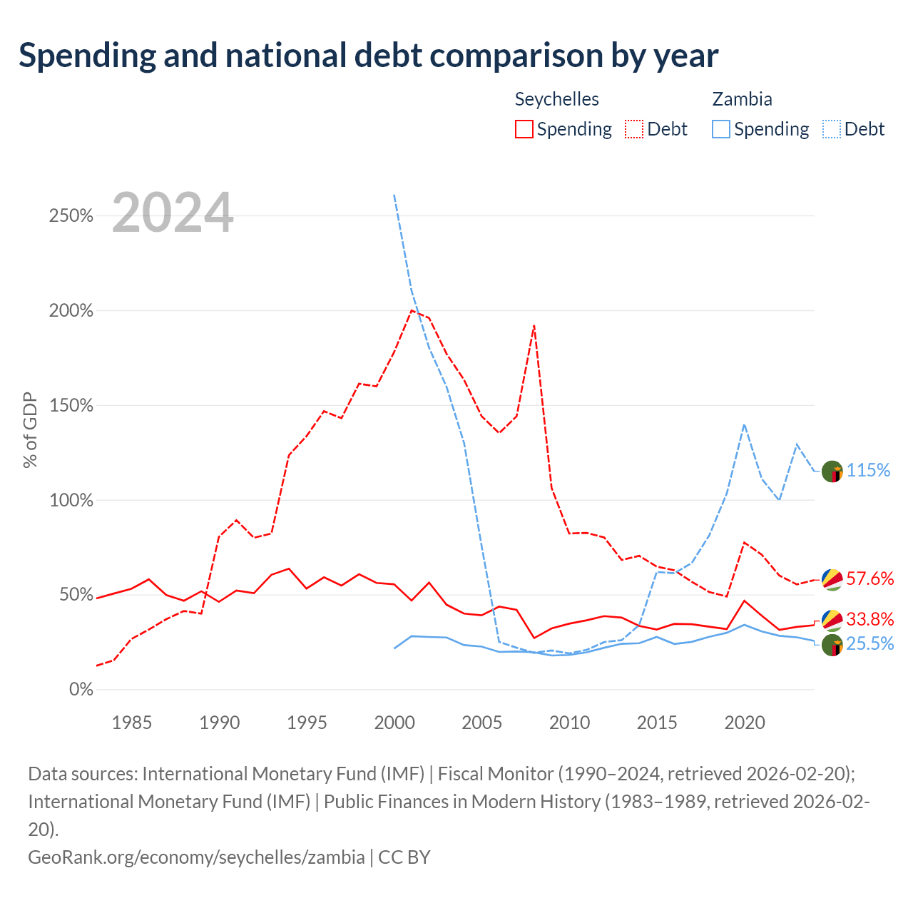 The Seychelles has $1.25B in government debt (57.6% of GDP), compared to $29.1B (114.9% of GDP) in Zambia.