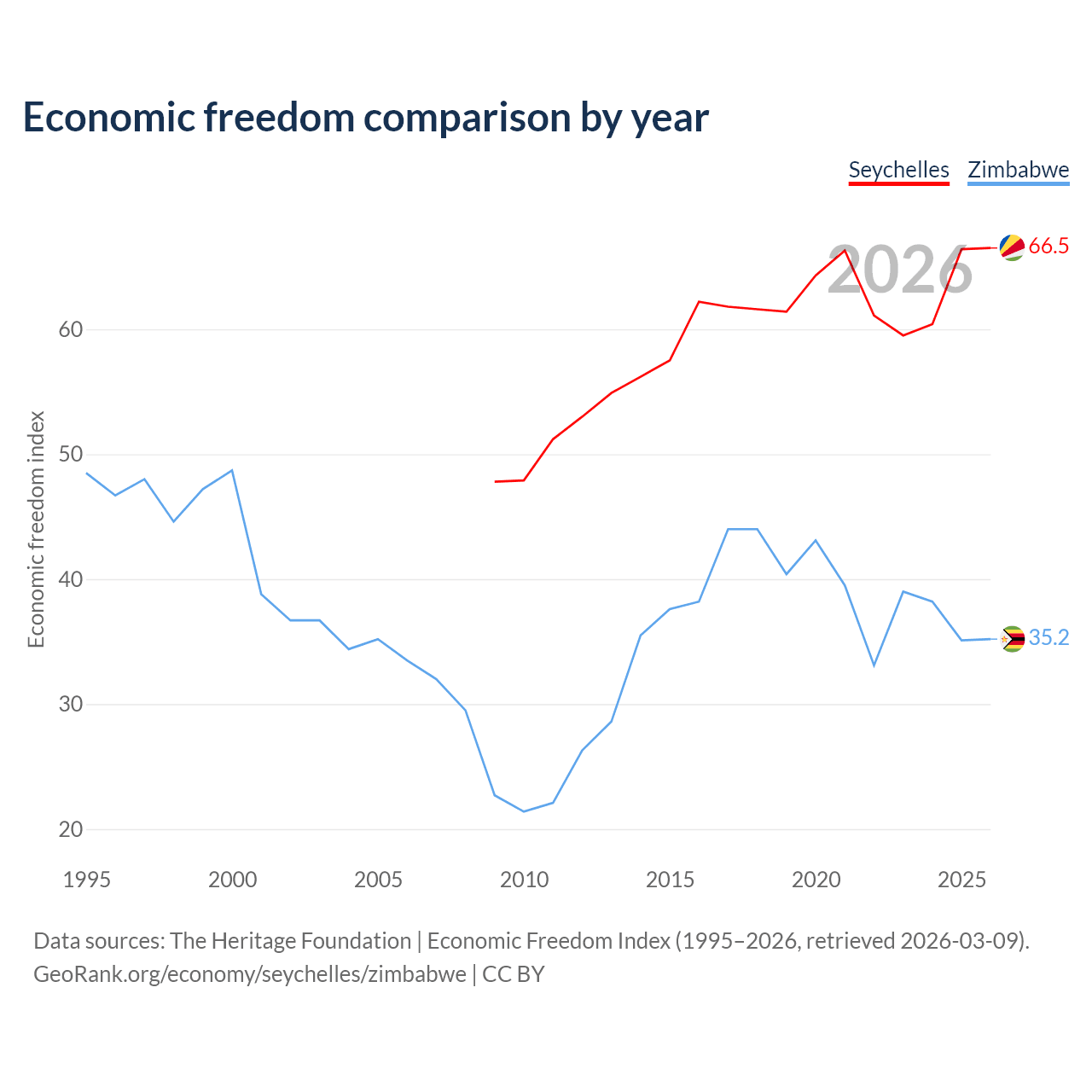 The Economic Freedom Index for the Seychelles is 66.5, ranking 60/197, compared to 35.2 for Zimbabwe, ranking 190/197. The chart above displays a comparison of annual changes in economic freedom indexes.