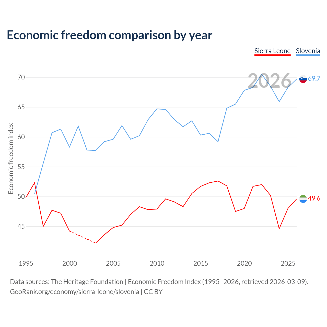 The Economic Freedom Index for Sierra Leone is 49.6, ranking 165/197, compared to 69.7 for Slovenia, ranking 40/197. The chart above displays a comparison of annual changes in economic freedom indexes.