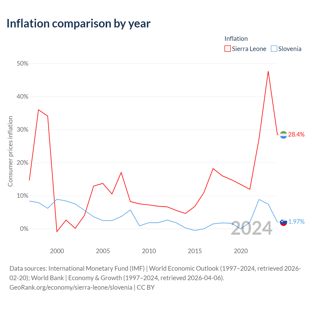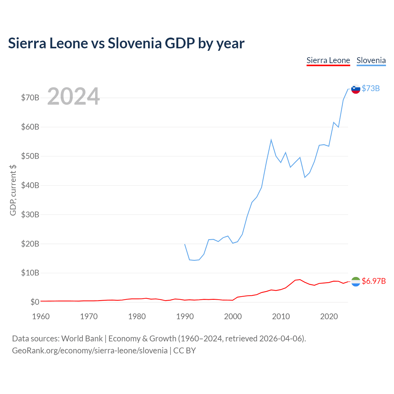 Sierra Leone has a GDP of $6.97B compared to $73B for Slovenia, ranking 160/197 and 86/197 by economy size, respectively.