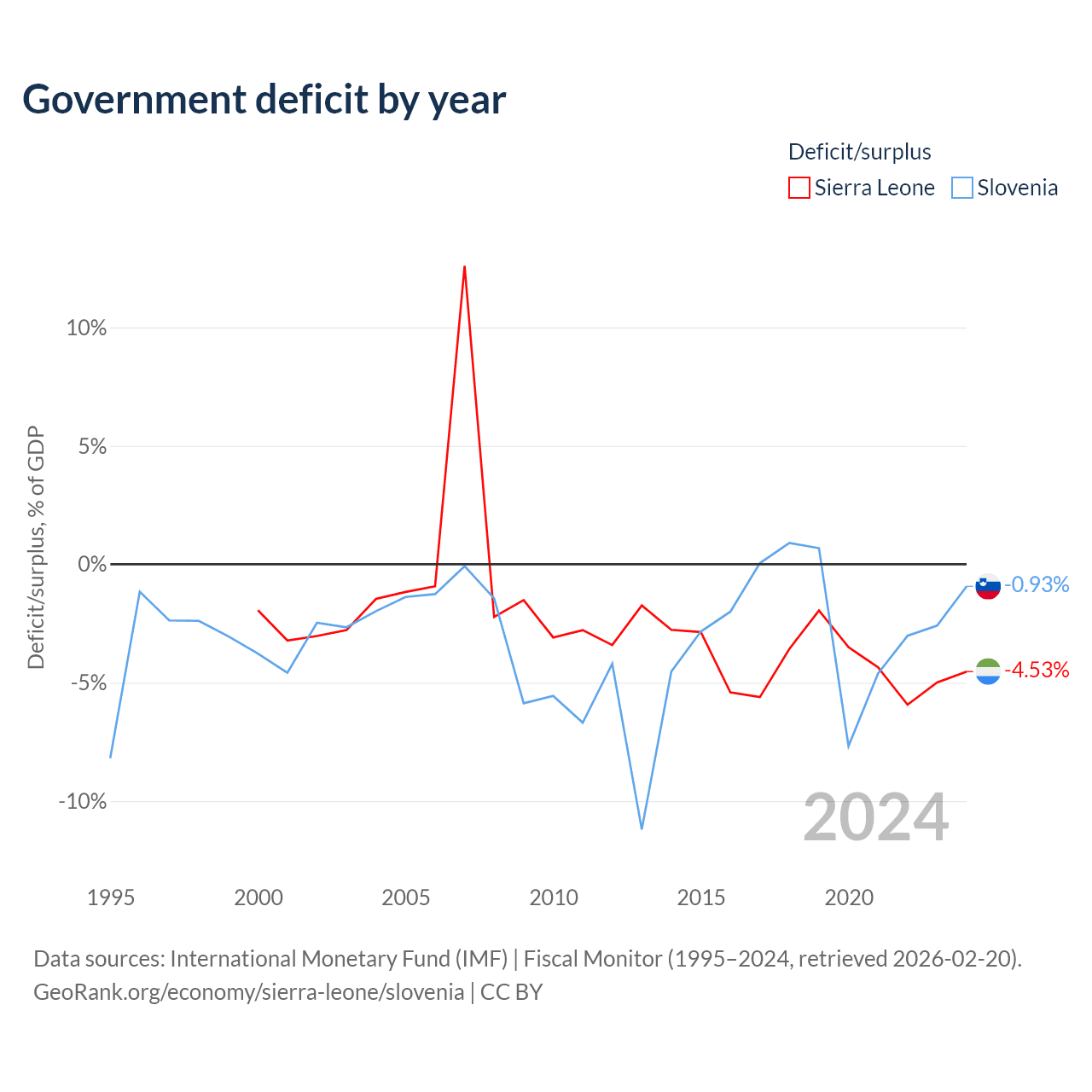 Sierra Leone has $2.91B in government debt (41.7% of GDP), compared to $48.6B (66.6% of GDP) in Slovenia.