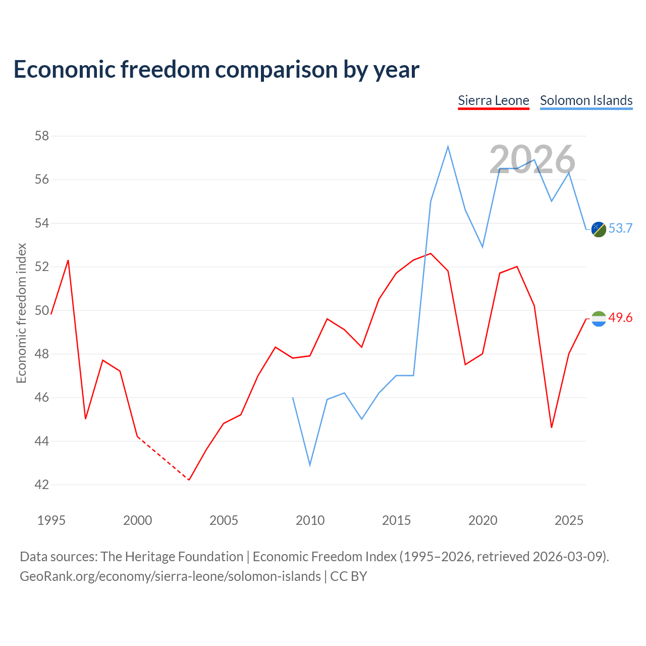 The Economic Freedom Index for Sierra Leone is 49.6, ranking 165/197, compared to 53.7 for the Solomon Islands, ranking 137/197. The chart above displays a comparison of annual changes in economic freedom indexes.