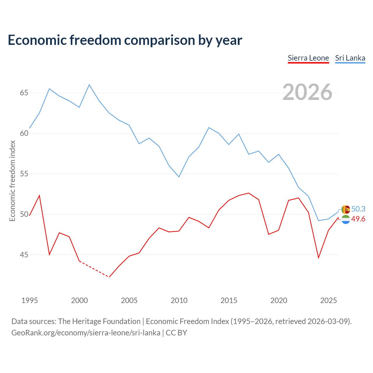 The Economic Freedom Index for Sierra Leone is 49.6, ranking 165/197, compared to 50.3 for Sri Lanka, ranking 162/197. The chart above displays a comparison of annual changes in economic freedom indexes.