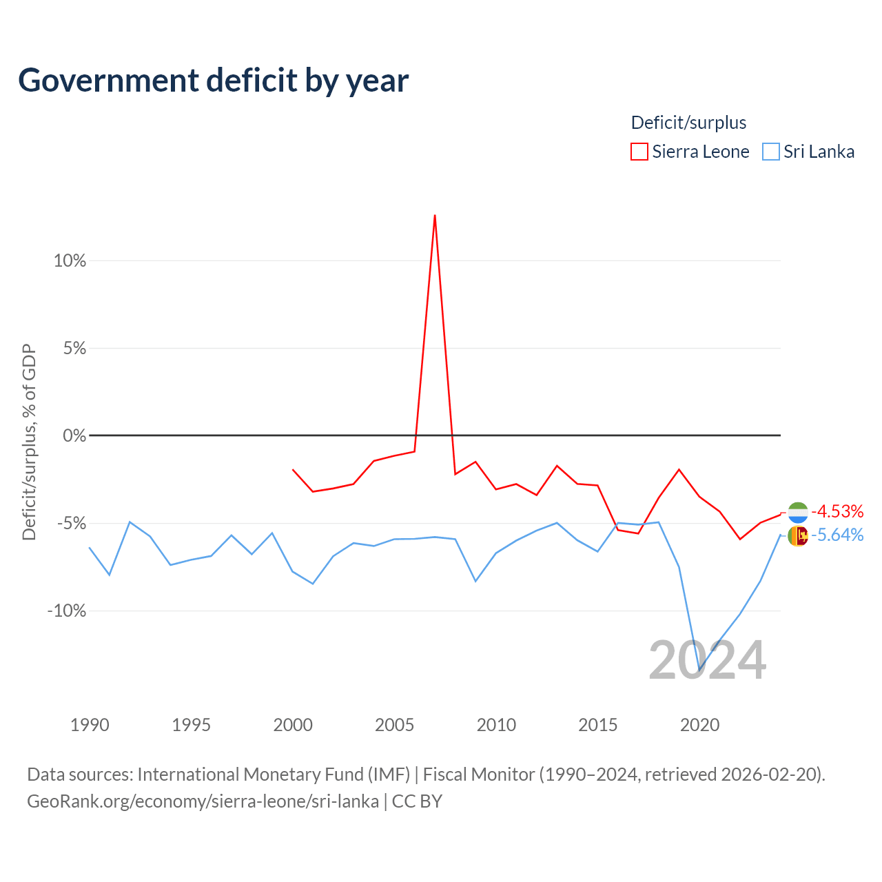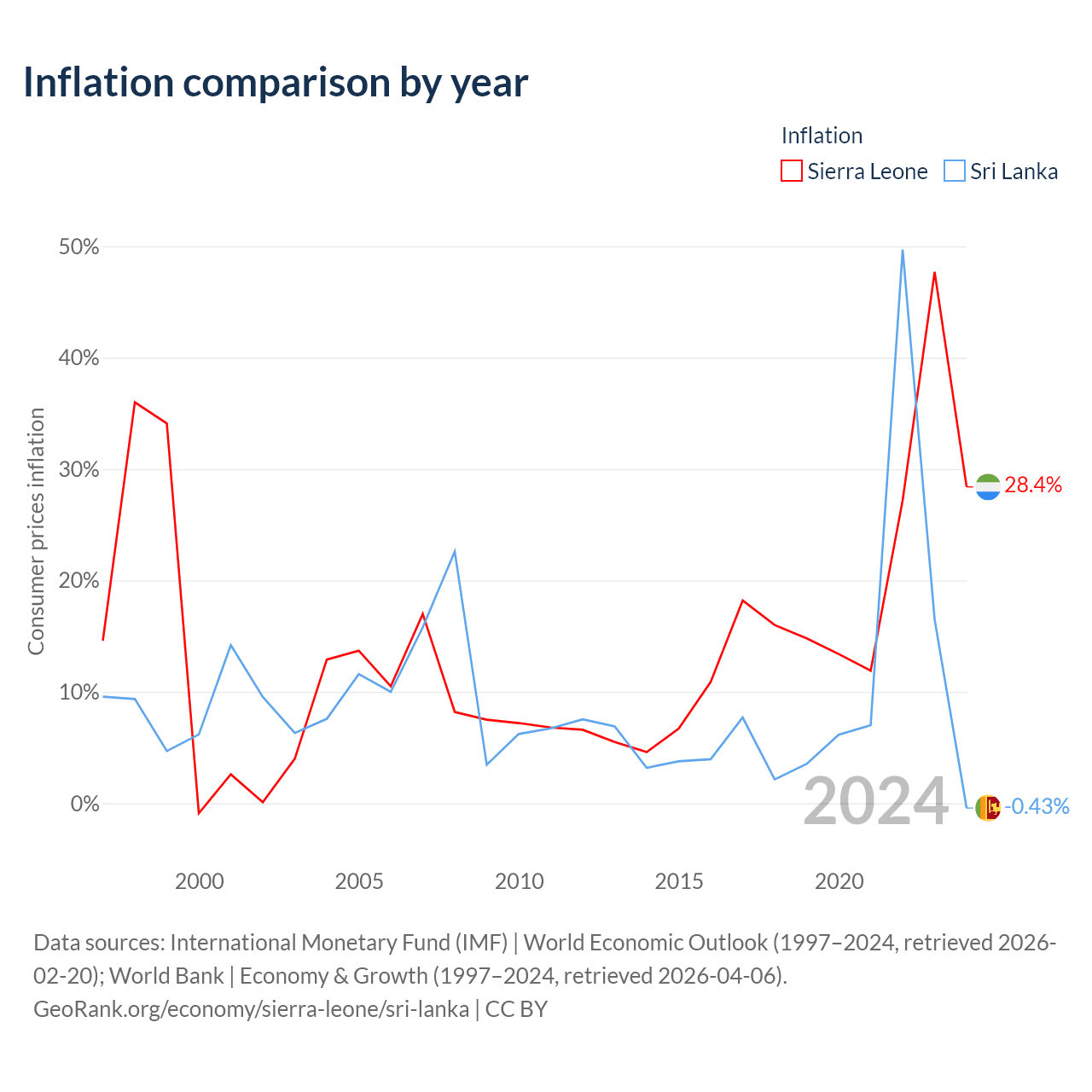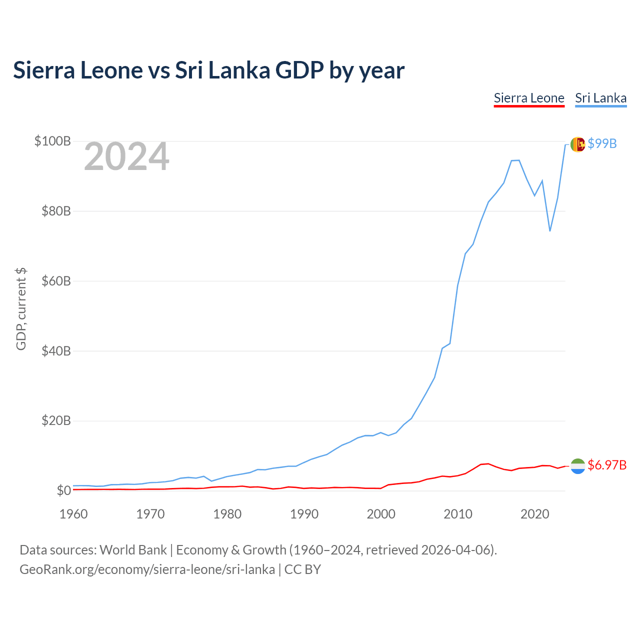 Sierra Leone has a GDP of $6.97B compared to $99B for Sri Lanka, ranking 160/197 and 72/197 by economy size, respectively.
