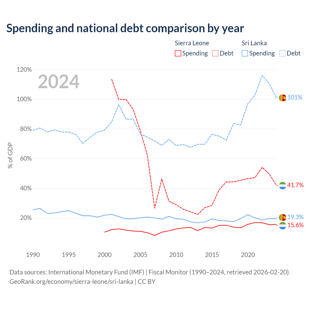 Sierra Leone has $2.91B in government debt (41.7% of GDP), compared to $99.8B (100.8% of GDP) in Sri Lanka.